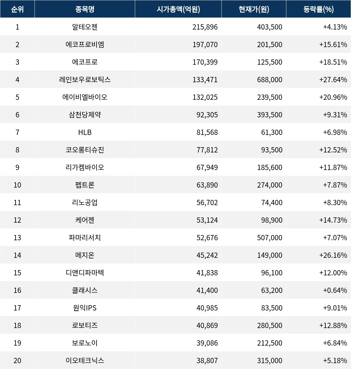 26일 한국거래소에 따르면, 시가총액 1위인 알테오젠(196170)은 현재가 403,500원으로 전 거래일 대비 4.13% 오르며 강세를 보이고 있다. 시가총액은 21조 5896억원이며, 외국인 비율은 13.40%다. 거래량은 1,231,851주에 달하며, PER 171.85배, ROE 29.52%로 재무 지표에서 긍정적인 모습을 보인다. 2위인 에코프로비엠(247540)은 201,500원으로 15.61% 급등하며, 거래량은 3,011,627주다. 시가총액은 19조 7070억원이며, 외국인 비율은 12.74%다. PER은 6,296.88배로 상당히 높은 편이며, ROE는 -6.26%다.