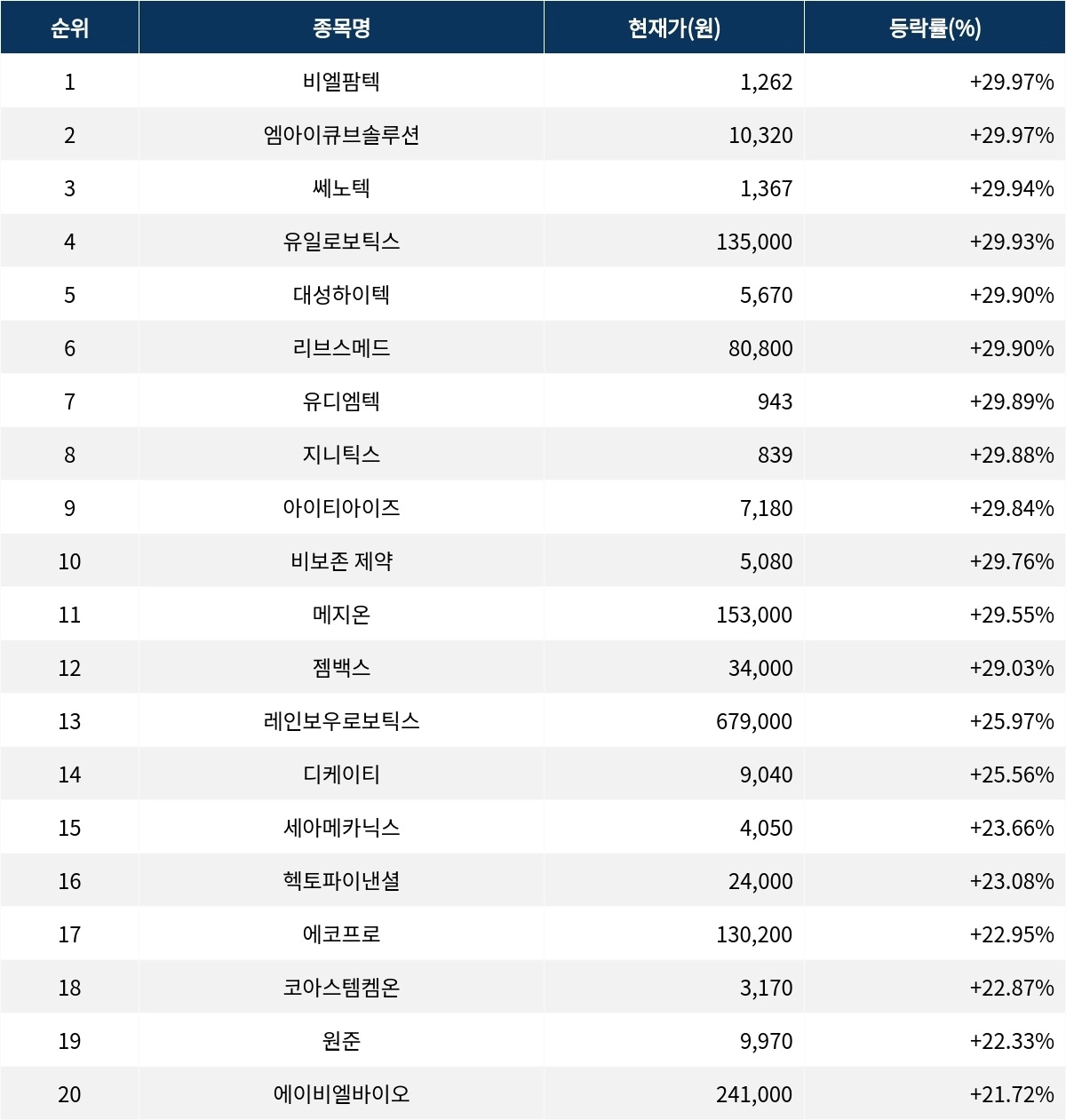 6위 리브스메드(491000)는 80,800원으로 29.90% 상승 마감했다. 7위 유디엠텍(389680)은 종가 943원으로 29.89% 상승 마감했다. 8위 지니틱스(303030)는 종가 839원으로 29.88% 상승 마감했다. 9위 아이티아이즈(372800)는 7,180원으로 29.84% 상승 마감했다. 10위 비보존 제약(082800)은 5,080원으로 29.76% 상승 마감했다.