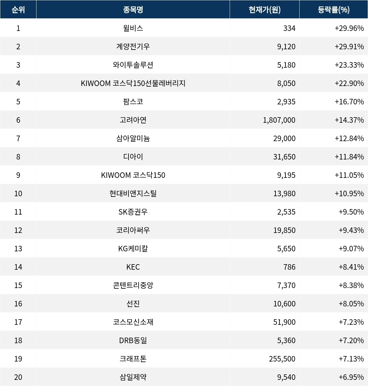 6위 고려아연(010130)은 1,807,000원으로 14.37% 급등 마감했다. 7위 삼아알미늄(006110)은 종가 29,000원으로 12.84% 급등 마감했다. 8위 디아이(003160)는 종가 31,650원으로 11.84% 급등 마감했다. 9위 KIWOOM 코스닥150(316670)은 9,195원으로 11.05% 급등 마감했다. 10위 현대비앤지스틸(004560)은 13,980원으로 10.95% 상승 마감했다.