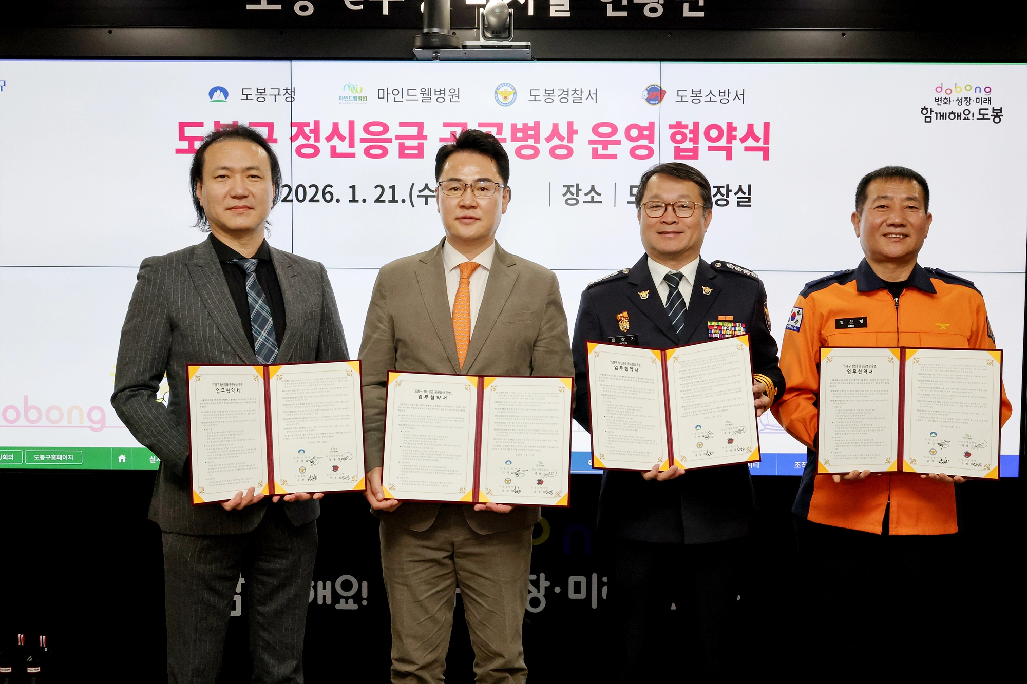 야간, 주말·공휴일에 발생하는 정신과적 위기 상황에 대비하고 자·타해 위험이 높은 정신과적 응급상황에 신속히 대응하기 위해 지난 21일 관계 기관과 업무협약을 체결했다. 협약에는 마인드웰병원을 비롯해 도봉경찰서, 도봉소방서가 참여했다.