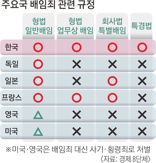 이들은 건의문에서 “국회가 약속했던 배임죄 개선 논의가 지연돼 불확실성이 커지고 있다”며 “우리 경제의 위상에 맞게 배임죄를 전면 개편하고 경영 판단 원칙을 명문화할 것을 촉구한다”고 밝혔다. 이어 “배임죄 개편의 보완책으로 거론되는 징벌적 손해배상, 디스커버리 제도 등은 경영 부담을 오히려 가중시킬 수 있다”고 지적했다. 징벌적 손해배상은 고의적 과실에 가중 처벌을 하는 것이 골자다. 또 디스커버리 제도는 소송 전에 증거를 강제로 공개하는 제도다. 경제8단체는 그 대신 미국이나 영국처럼 사기·횡령죄 또는 민사 절차로 해결하거나 독일·일본처럼 적용 대상과 처벌 행위 등 배임죄 구성요건을 명확히 할 것을 제안했다. 기업인의 합리적인 경영 판단이 실패했다는 이유로 배임 혐의를 씌운다면, 신사업 진출이나 투자 결정이 위축된다는 것이다.