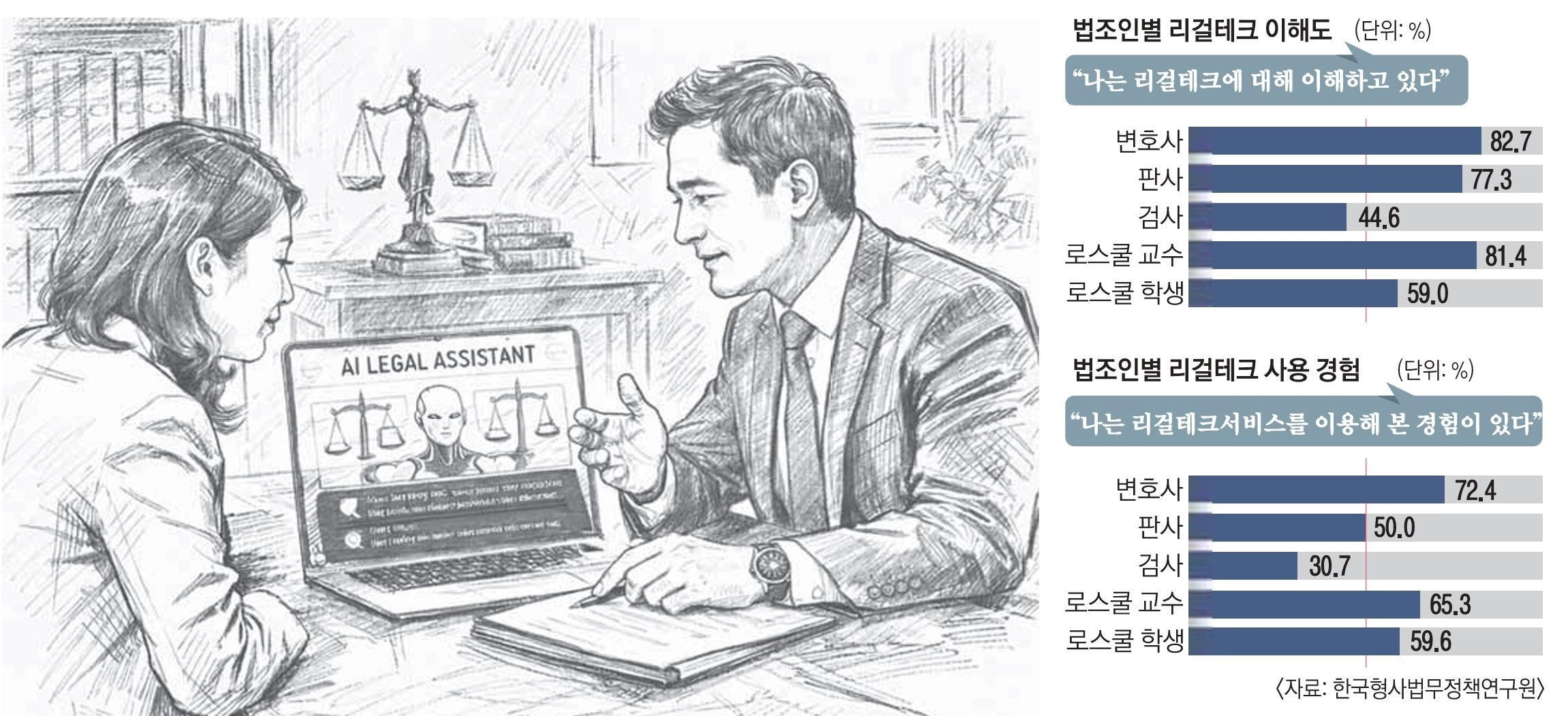 한국형사법무정책연구원이 지난 2024년 실시한 법조계의 리걸테크(법률 정보 기술) 인식조사 결과에 따르면 응답자 중 변호사의 72.4%, 판사의 50%, 검사의 30.7%, 로스쿨 교수의 65.3%, 로스쿨 학생의 59.6%가 각각 “리걸테크 서비스를 직접 사용해본 경험이 있다”고 답하는 등 법조계 전반에서 AI 활용은 이미 일반화된 상황이다. ‘슈퍼로이어’, ‘엘박스’ 등 리걸테크 산업이 성장하면서 주요 대형 로펌들도 일제히 자체 개발 AI를 준비하며 변화하는 시장에 대응하는 분위기다.