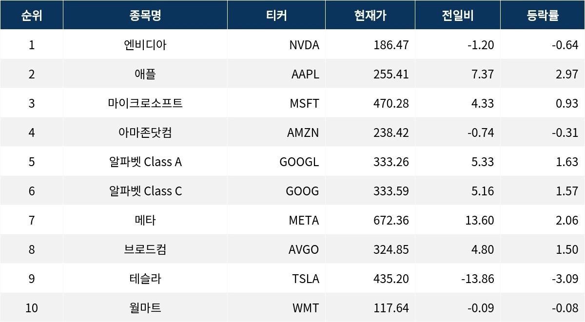 애플(AAPL)은 2.97% 상승하여 255.41 달러로 장을 마감했다. 메타(META) 또한 2.06% 상승하여 672.36 달러에 거래되었다. 알파벳 Class A(GOOGL)는 1.63% 상승하여 333.26 달러를 기록했다.