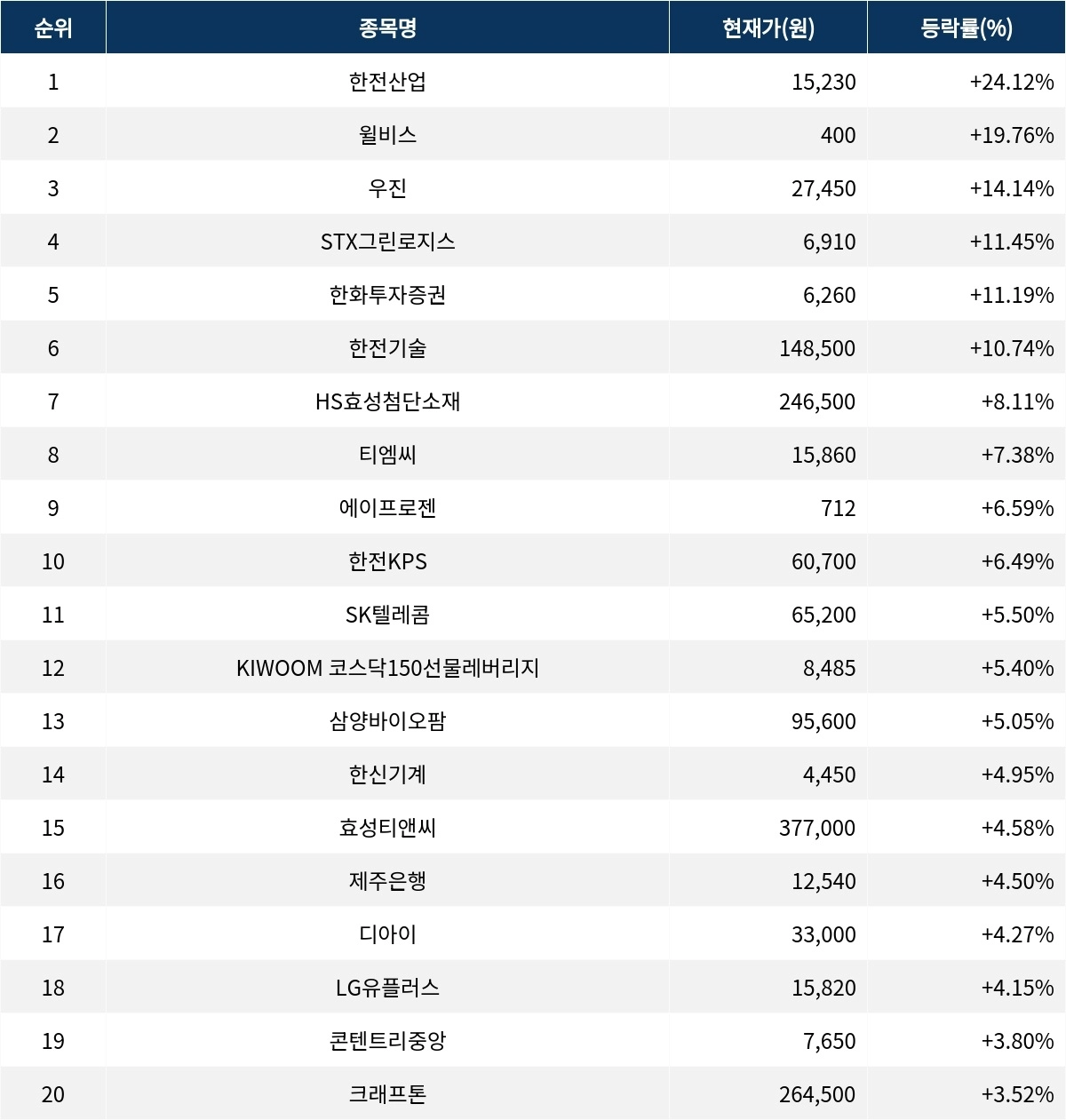 6위 한전기술(052690)은 현재가 14만 8500원으로 10.74% 상승 중이다. 7위 HS효성첨단소재(298050)는 현재가 24만 6500원으로 8.11% 상승 중이다. 8위 티엠씨(217590)는 현재가 1만 5860원으로 7.38% 상승 중이다. 9위 에이프로젠(007460)은 현재가 712원으로 6.59% 상승 중이다. 10위 한전KPS(051600)는 현재가 6만 700원으로 6.49% 상승 중이다.