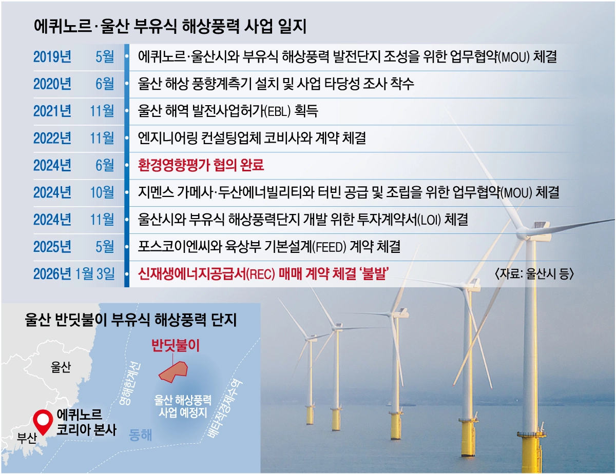 노르웨이의 국영 에너지 기업 에퀴노르는 2019년 울산시가 추진하는 ‘반딧불이 부유식 해상풍력단지’에 참여했다. 전체 6.2GW 규모의 매머드급 프로젝트에서 750㎿ 발전단지를 조성하는 사업에 입찰한 것이다. 하지만 에퀴노르는 사업권 낙찰 이후 재생에너지 공급인증서(REC) 매매 계약을 체결하지 않았다. 이후 에퀴노르는 국제 원자재 가격 상승과 원화 약세 등으로 사업비 부담이 커졌다며 울산시에 가격제안서도 제출하지 않았다.
