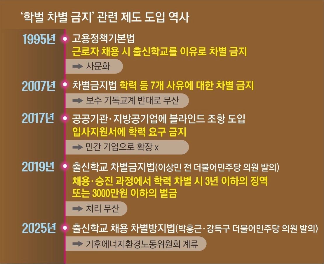 학벌 차별 금지는 어제 오늘의 문제는 아니다. 30년 전으로 거슬러 올라가면 채용 차별 금지의 대원칙을 세운 ‘고용정책기본법’이 있었다. 하지만 1995년 제정된 이 법은 선언적 성격에 그쳐 사문화됐다는 비판을 받았다. 고용정책기본법 7조는 “사업주는 근로자를 모집·채용할 때 학력·출신학교 등을 이유로 차별해선 안 된다”고 적시하고 있지만, 이력서에 출신학교를 기재하게 하는 행위는 직접적으로 막지 못했다.