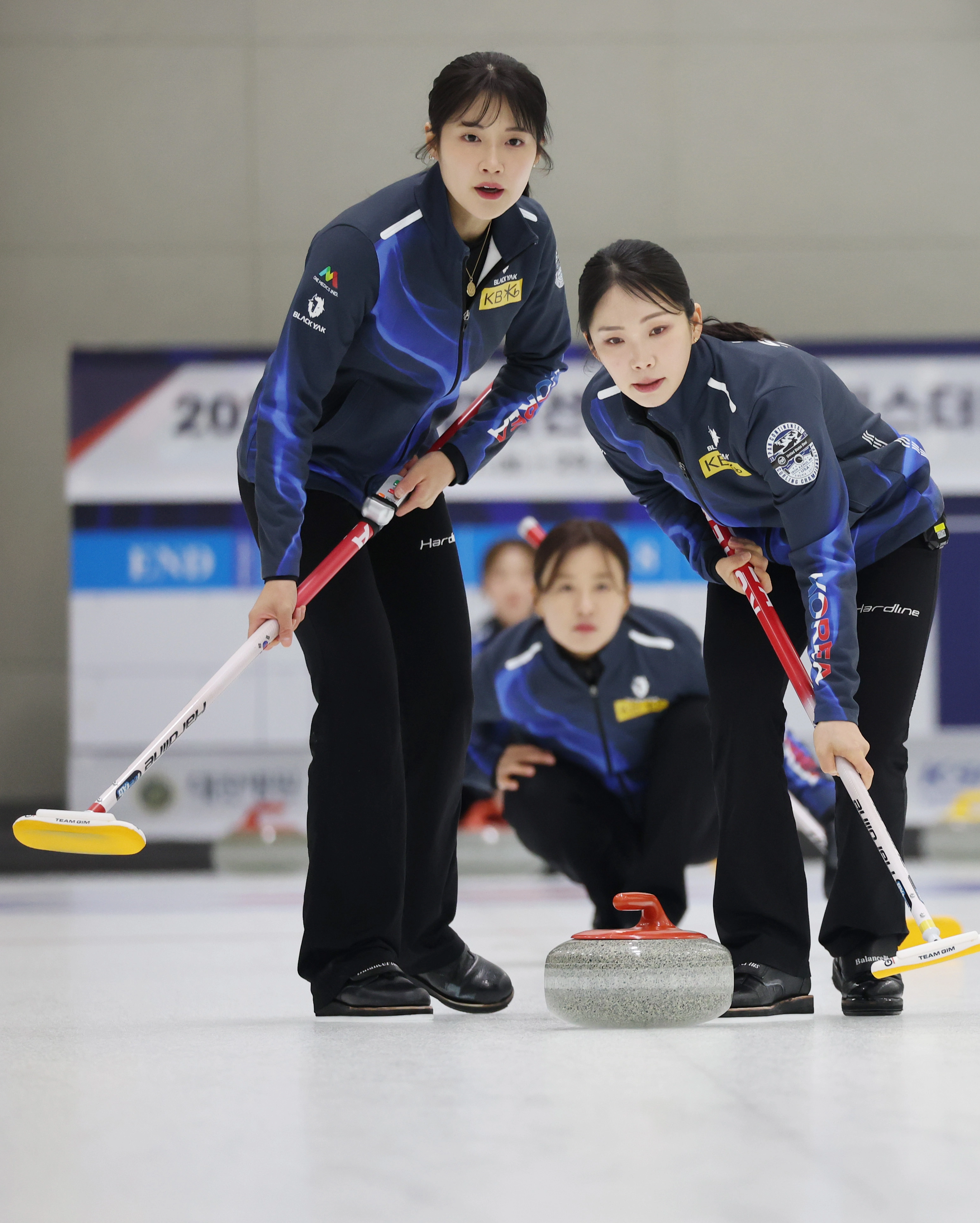 컬링 국가대표팀 설예은(왼쪽부터), 김은지, 김수지가 2026 밀라노·코르티나담페초 동계 올림픽을 앞두고 27일 충북 진천선수촌 컬링장에서 막바지 훈련을 하고 있다. 컬링 대표팀은 여자팀 5명과 믹스더블 2명 등 모두 7명이 이번 올림픽에 출전한다.