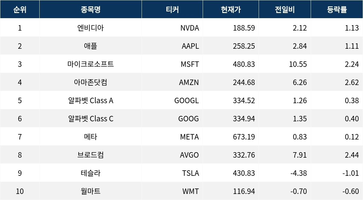 애플(AAPL)은 1.11% 상승하며 258.25달러를 기록했다. 알파벳 Class A(GOOGL)와 알파벳 Class C(GOOG)는 각각 0.38%, 0.40% 상승하며 보합세를 보였다. 메타(META)는 0.12% 상승해 673.19달러에 거래를 마쳤다.