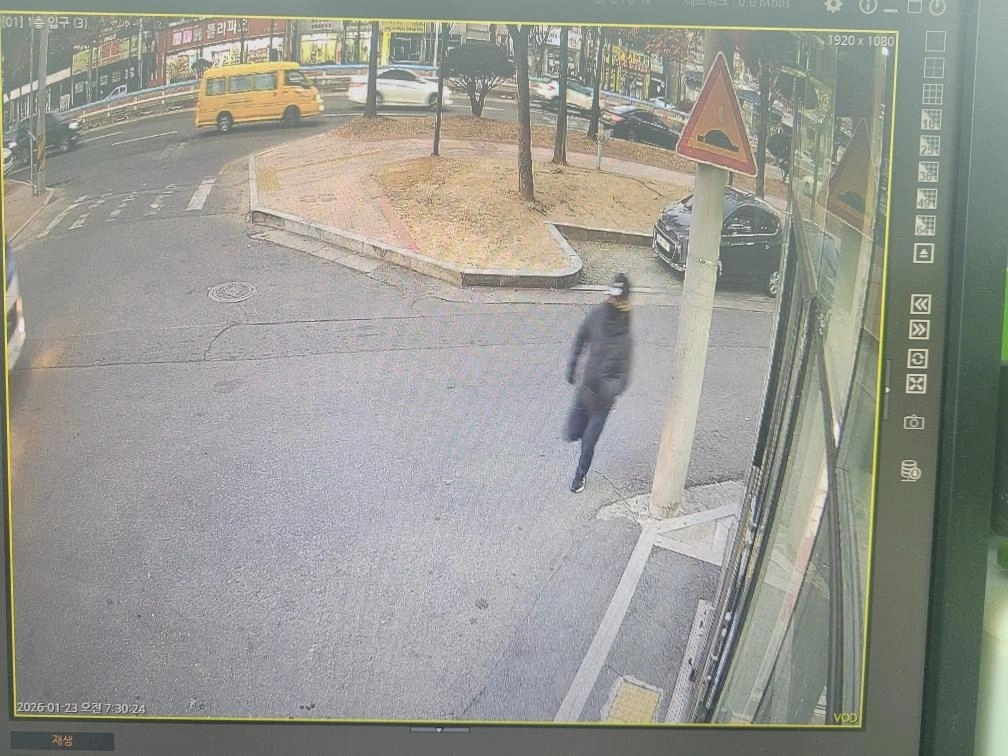 A씨가 공개한 CCTV 영상 화면에는 검은색 상하의 차림에 모자와 마스크를 착용한 남성이 폭행 직후 도주하는 장면이 담겨 있었다. 도주하는 장면은 인근 생활용품점 근처에서 찍힌 것으로 전해졌다.