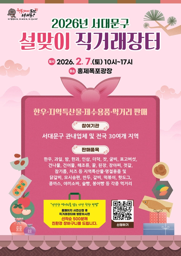 서울 서대문구가 설 명절을 앞두고 시민에게 안전하고 품질 좋은 명절 먹거리를 합리적 가격에 제공하기 위해 다음달 7일 오전 10시부터 오후 5시까지 홍제폭포광장에서 ‘설맞이 직거래장터’를 연다고 28일 밝혔다.