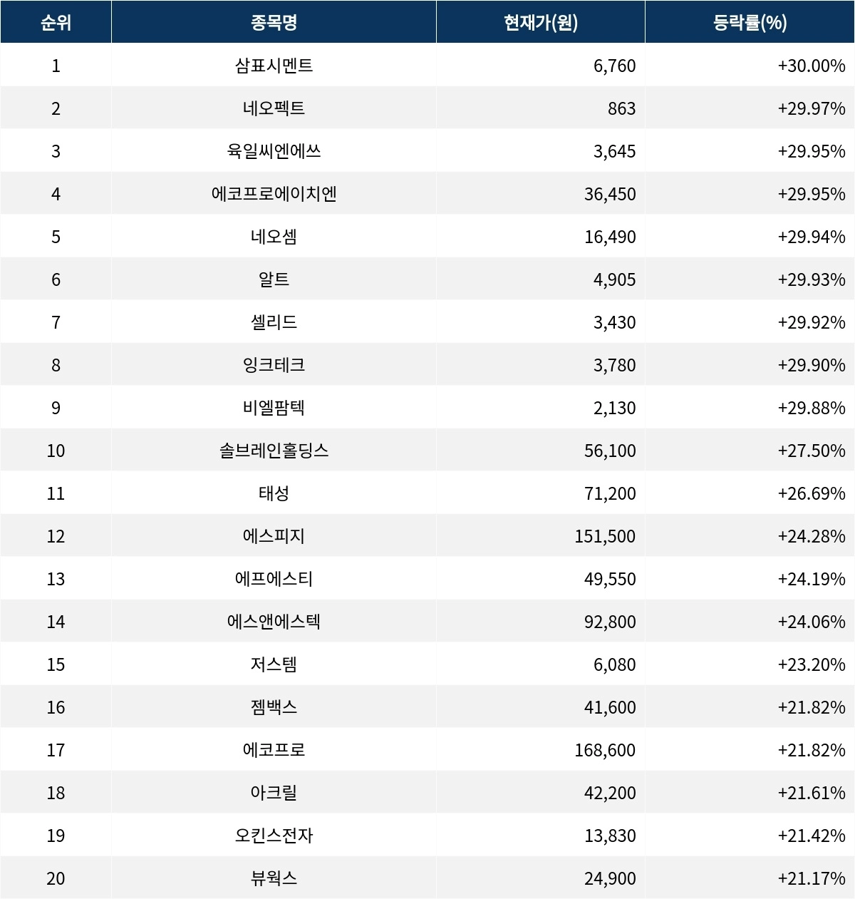 6위 알트(459550)는 4,905원으로 29.93% 상승 마감했다. 7위 셀리드(299660)는 종가 3,430원으로 29.92% 상승 마감했다. 8위 잉크테크(049550)는 종가 3,780원으로 29.90% 상승 마감했다. 9위 비엘팜텍(065170)은 2,130원으로 29.88% 상승 마감했다. 10위 솔브레인홀딩스(036830)는 56,100원으로 27.50% 상승 마감했다.