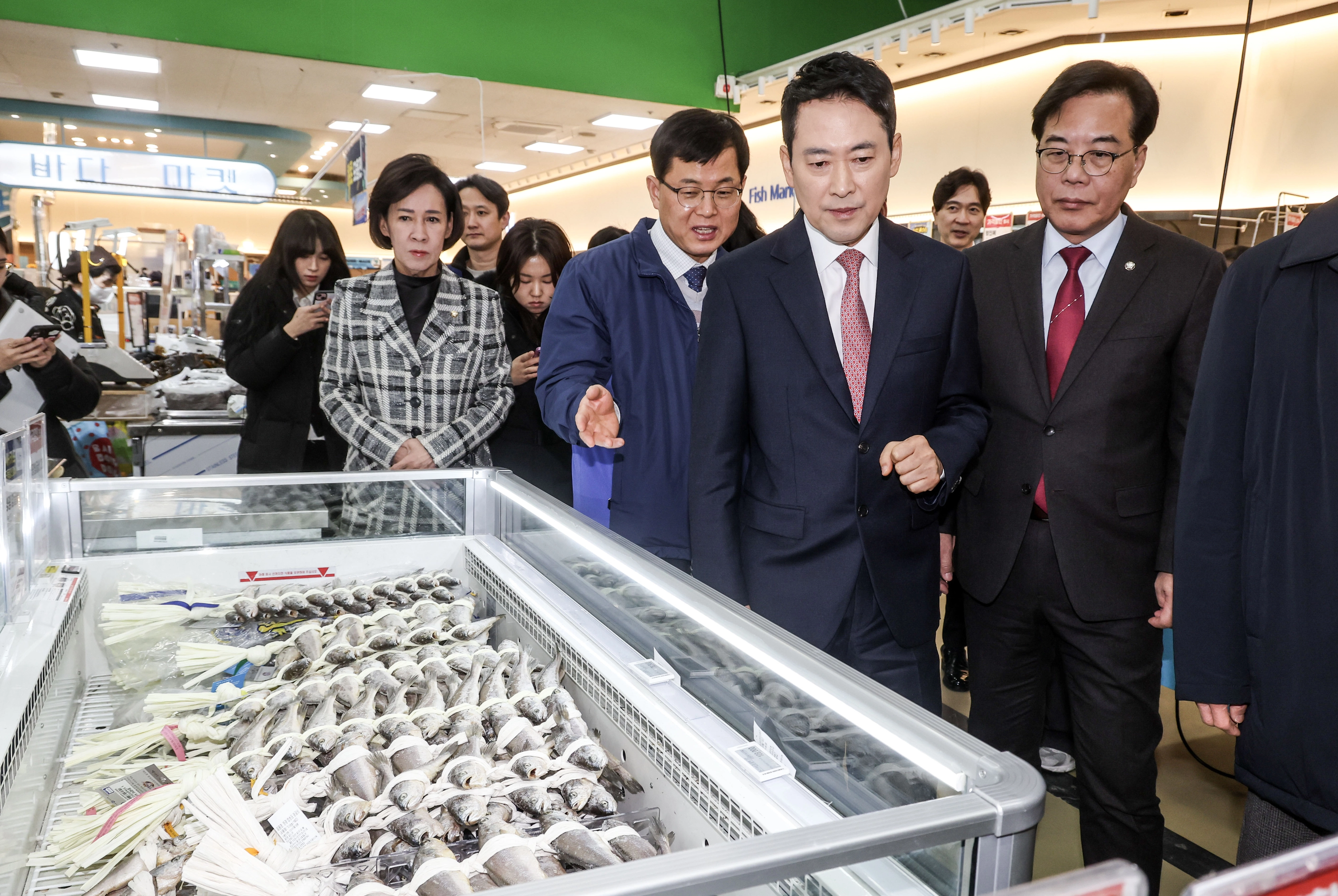 단식 후 회복을 마치고 당무에 복귀한 장동혁(오른쪽 두 번째) 국민의힘 대표가 28일 생활 물가 점검을 위해 서울 서초구 하나로마트 양재점의 수산물 코너를 둘러보고 있다. 홍윤기 기자