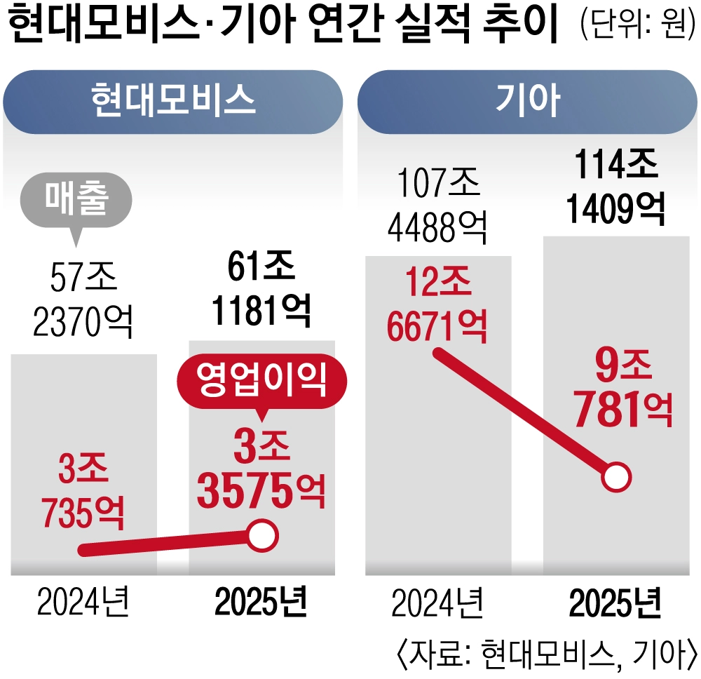 현대자동차그룹의 계열사인 현대모비스와 기아가 지난해 나란히 역대 최대 매출을 기록했지만, 영업이익에서 희비가 엇갈렸다. 미국의 고율 관세 부담 속에서도 현대모비스는 고부가 핵심 부품 성장과 사후 정비용(A/S) 부품 수요 증가에 힘입어 영업이익도 역대 최고를 기록했고, 로봇 사업으로 성장세를 이어갈 전망이다. 관세 직격탄을 맞은 기아는 영업이익이 28%가량 감소했다.