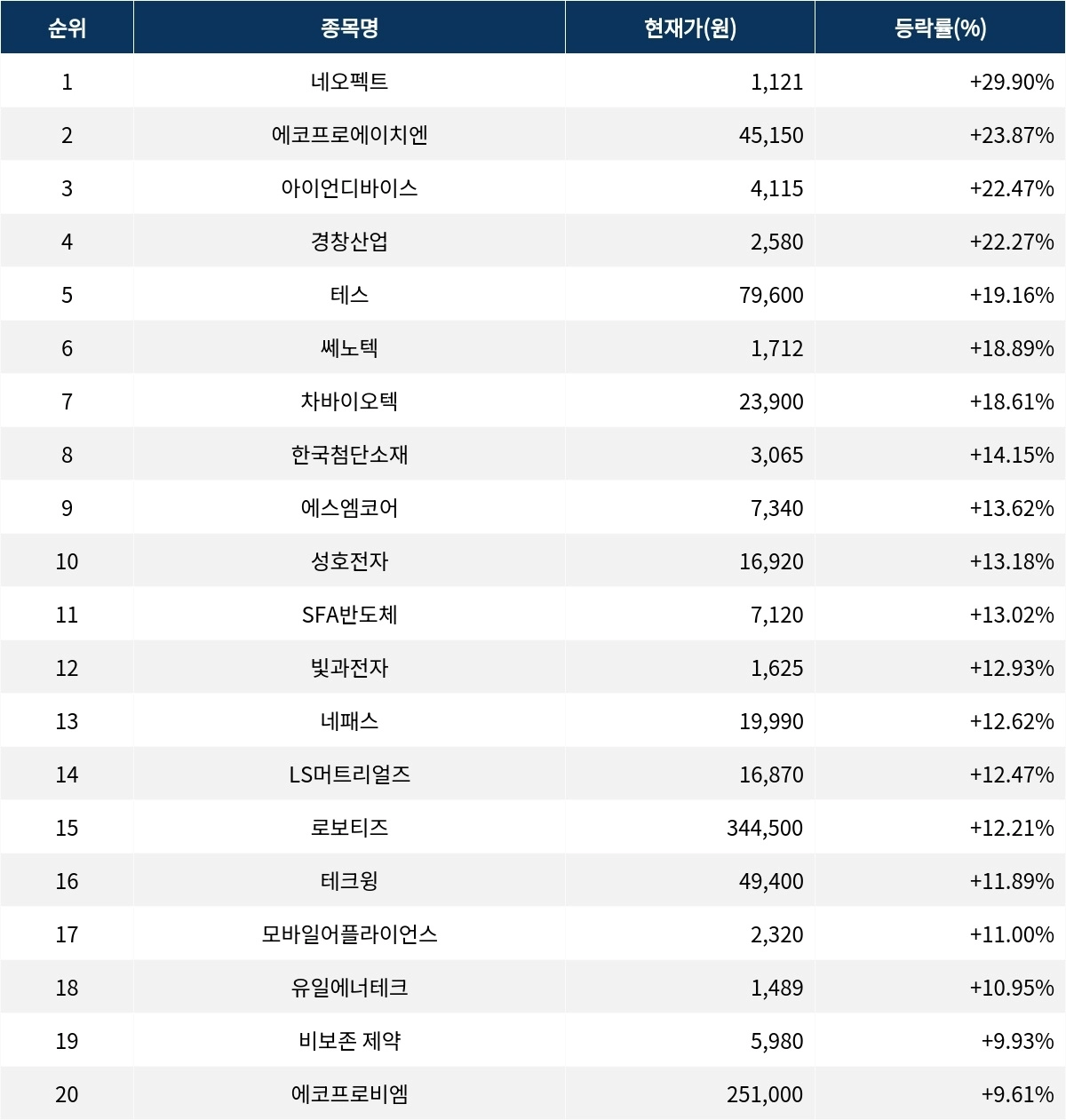 6위 쎄노텍(222420)은 현재가 1712원으로 18.89% 상승 중이다. 7위 차바이오텍(085660)은 현재가 2만 3900원으로 18.61% 상승 중이다. 8위 한국첨단소재(062970)는 현재가 3065원으로 14.15% 상승 중이다. 9위 에스엠코어(007820)는 현재가 7340원으로 13.62% 상승 중이다. 10위 성호전자(043260)는 현재가 1만 6920원으로 13.18% 상승 중이다.