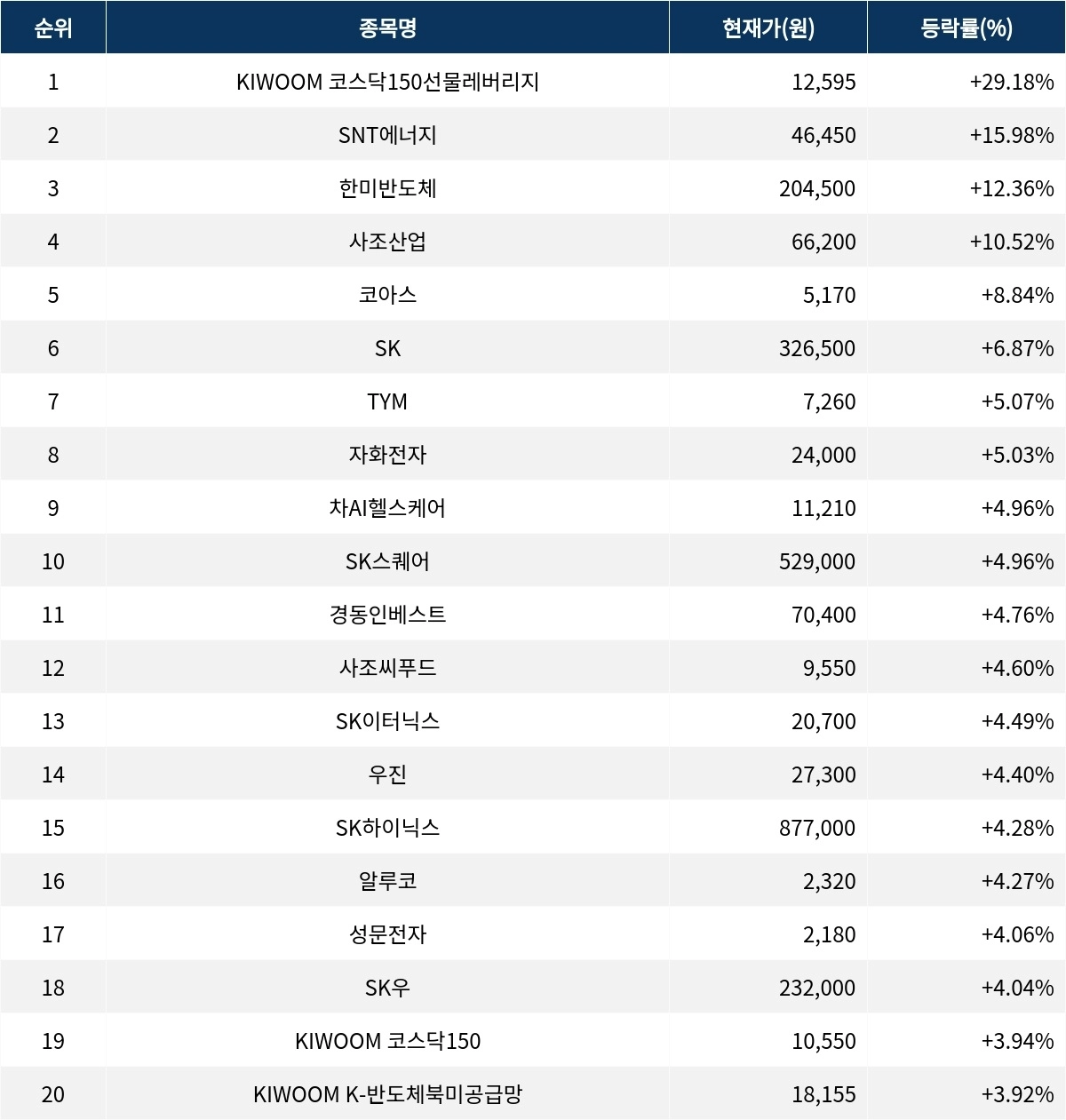 6위 SK(034730)는 현재가 32만 6500원으로 6.87% 상승 중이다. 7위 TYM(002900)은 현재가 7260원으로 5.07% 상승 중이다. 8위 자화전자(033240)는 현재가 2만 4000원으로 5.03% 상승 중이다. 9위 차AI헬스케어(025620)는 현재가 1만 1210원으로 4.96% 상승 중이다. 10위 SK스퀘어(402340)는 현재가 52만 9000원으로 4.96% 상승 중이다.