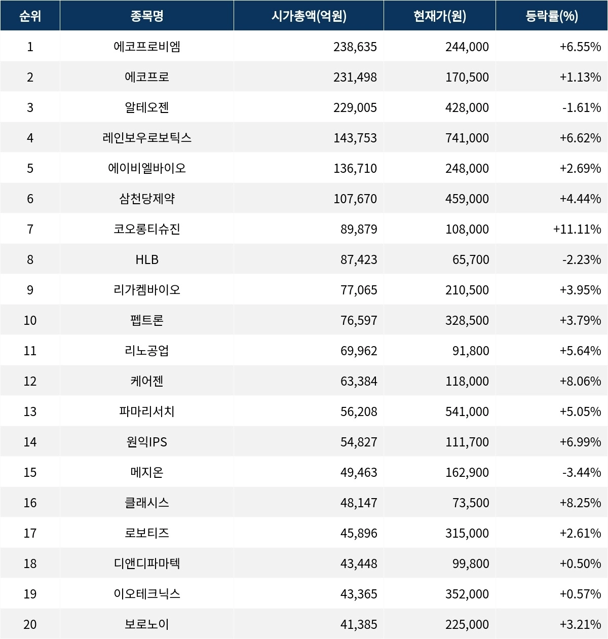 시가총액 3위부터 10위까지의 종목들 가운데 알테오젠(196170)은 -1.61%, 레인보우로보틱스(277810)는 +6.62%, 에이비엘바이오(298380)는 +2.69%, 삼천당제약(000250)은 +4.44%, 코오롱티슈진(950160)은 +11.11%의 등락률을 기록하고 있다. HLB(028300)는 -2.23%, 리가켐바이오(141080)는 +3.95%, 펩트론(087010)은 +3.79%의 등락률을 보이고 있다.
