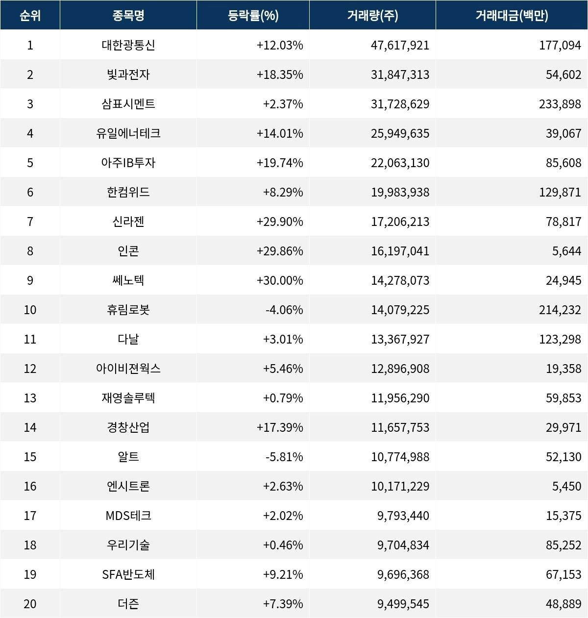 삼표시멘트(038500)는 3172만 8629주가 거래되며 거래량 3위를 기록하고 있다. 현재가는 6920원으로 2.37% 상승했다. 유일에너테크(340930)는 2594만 9635주가 거래되며 1530원에 거래 중이다. 아주IB투자(027360)는 2206만 3130주의 거래량과 함께 19.74% 상승하며 4155원에 거래되고 있다. 한컴위드(054920)는 1998만 3938주가 거래되며 8.29% 상승한 6270원에 거래 중이다. 신라젠(215600), 인콘(083640), 쎄노텍(222420)은 각각 1720만 6213주, 1619만 7041주, 1427만 8073주가 거래되며 각각 29.90%, 29.86%, 30.00%의 상승률을 기록하고 있다. 반면 휴림로봇(090710)은 1407만 9225주의 거래량과 함께 4.06% 하락한 15130원에 거래되고 있다.