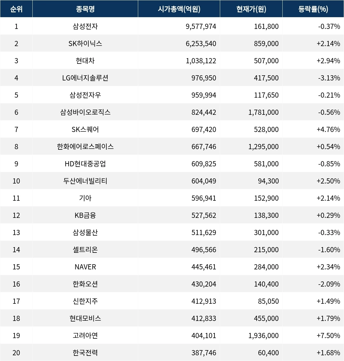 한편 시가총액 20위권 종목들은 기아(000270) ▲2.14%, KB금융(105560) ▲0.29%, 삼성물산(028260) ▼0.33%, 셀트리온(068270) ▼1.60%, NAVER(035420) ▲2.34%, 한화오션(042660) ▼2.09%, 신한지주(055550) ▲1.49%, 현대모비스(012330) ▲1.79%, 고려아연(010130) ▲7.50%, 한국전력(015760) ▲1.68% 등의 성적을 기록하고 있다.