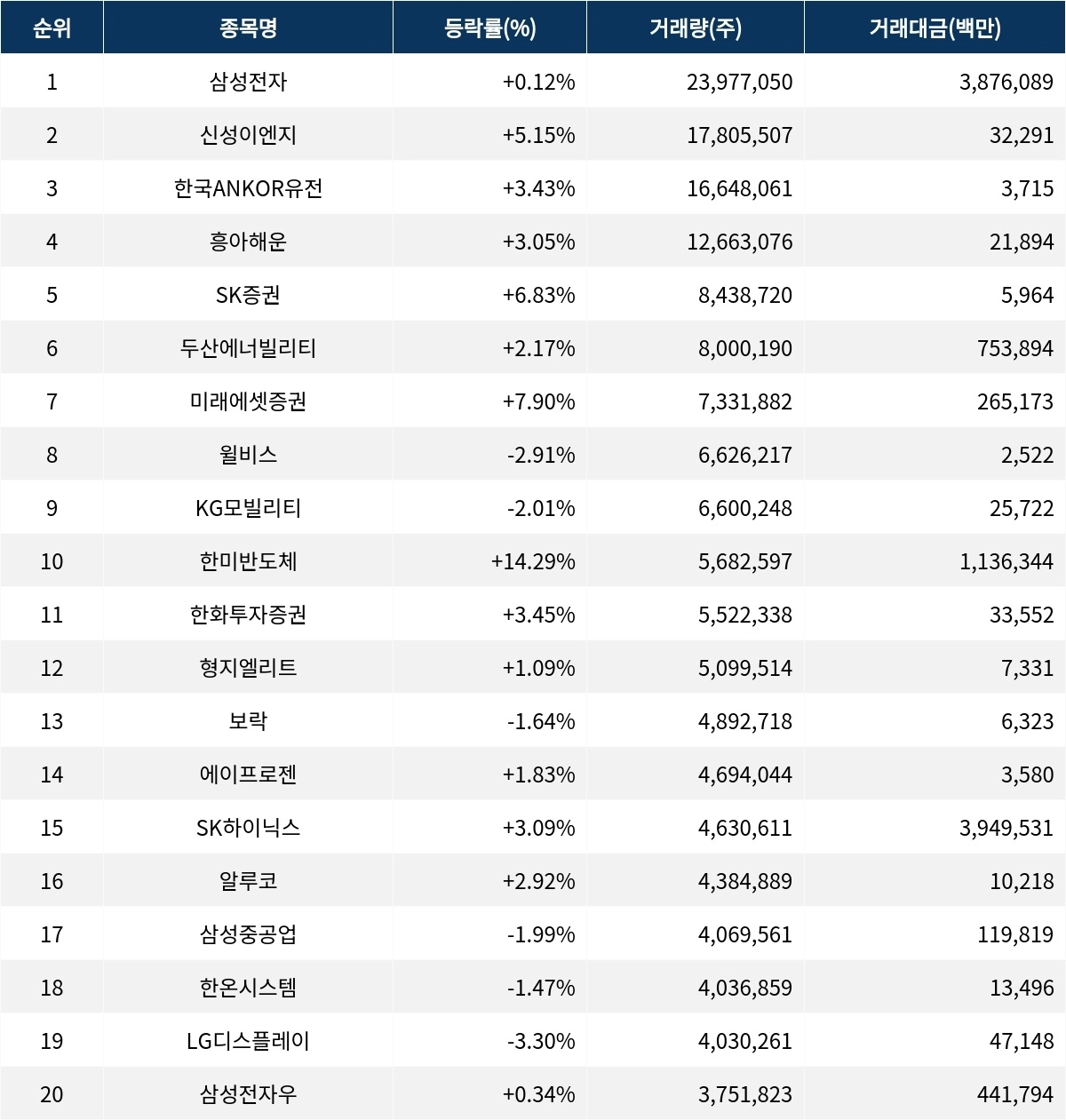 한편 거래량 상위 20위권 종목들은 한화투자증권(003530) ▲3.45%, 형지엘리트(093240) ▲1.09%, 보락(002760) ▼-1.64%, 에이프로젠(007460) ▲1.83%, SK하이닉스(000660) ▲3.09%, 알루코(001780) ▲2.92%, 삼성중공업(010140) ▼-1.99%, 한온시스템(018880) ▼-1.47%, LG디스플레이(034220) ▼-3.30%, 삼성전자우(005935) ▲0.34% 등의 성적을 기록했다.
