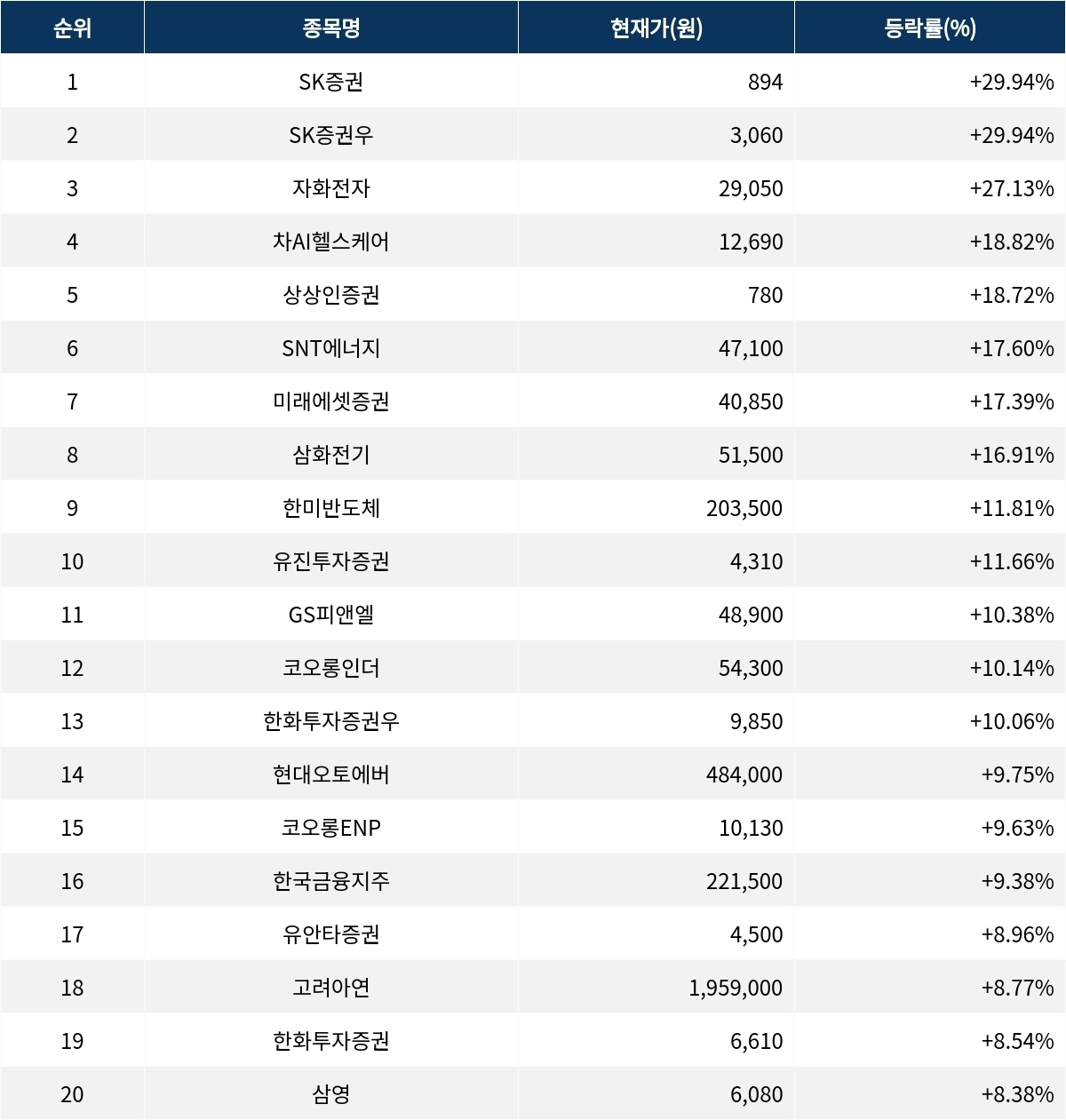6위 SNT에너지(100840)는 종가 47,100원으로 17.60% 상승 마감했다. 7위 미래에셋증권(006800)은 종가 40,850원으로 17.39% 상승 마감했다. 8위 삼화전기(009470)는 종가 51,500원으로 16.91% 상승 마감했다. 9위 한미반도체(042700)는 종가 203,500원으로 11.81% 상승 마감했다. 10위 유진투자증권(001200)은 종가 4,310원으로 11.66% 상승 마감했다.