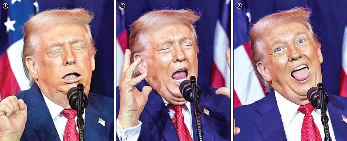 ① 도널드 트럼프 미국 대통령이 6일(현지시간) 워싱턴DC 문화예술 공연장 트럼프-케네디센터에서 열린 연방 하원 공화당 의원 수련회 연설에서 트랜스젠더 역도 선수가 눈을 질끈 감고 역기를 드는 흉내를 내며 조롱하고 있다. ② 트럼프 대통령은 이날 눈을 감고 입을 크게 벌리며 손가락으로 제스처를 취하기도 하고, ③ 혀를 내밀며 과장된 표정을 짓기도 했다. 트럼프 대통령은 이날 연설에서 ‘YMCA’ 노래를 부르며 춤을 추고 니콜라스 마두로 베네수엘라 대통령을 우스꽝스럽게 흉내냈다.워싱턴DC AP·로이터 연합뉴스