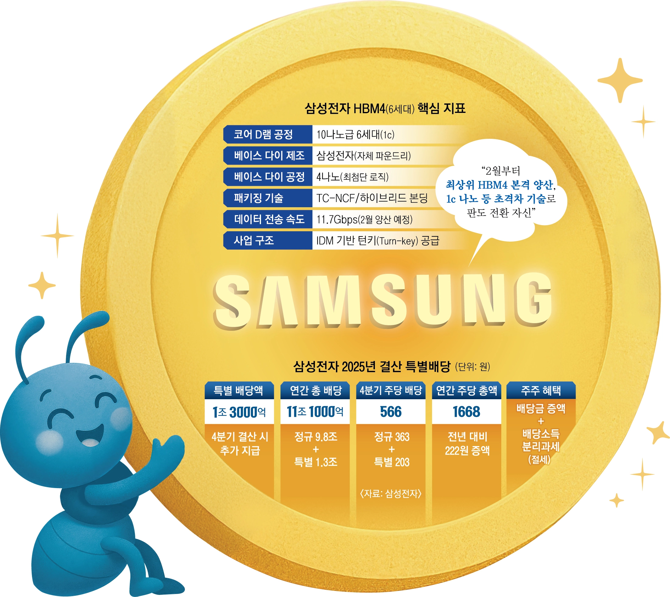 이번 특별배당은 삼성전자가 기록한 역대 최고 실적과도 맞닿아있다. 삼성전자의 연결 기준 지난해 4분기 매출은 93조 8374억원, 영업이익은 20조 737억원으로 각각 전년 동기보다 23.8%, 209.2% 증가했다. 분기 기준 매출과 영업이익 모두 역대 최고 기록으로, 국내 기업 중 분기 영업이익 20조원을 처음 상회하는 기록을 썼다. 역대급 실적의 중심에는 메모리 가격 급등과 고대역폭메모리(HBM) 경쟁력 회복이 자리하고 있다. 반도체 사업을 담당하는 디바이스솔루션(DS) 부문의 지난해 4분기 영업이익은 16조 4000억원으로 전체의 81.6%를 차지했다. 업계에선 ‘반도체 왕의 귀환’이라는 평가가 나왔다.