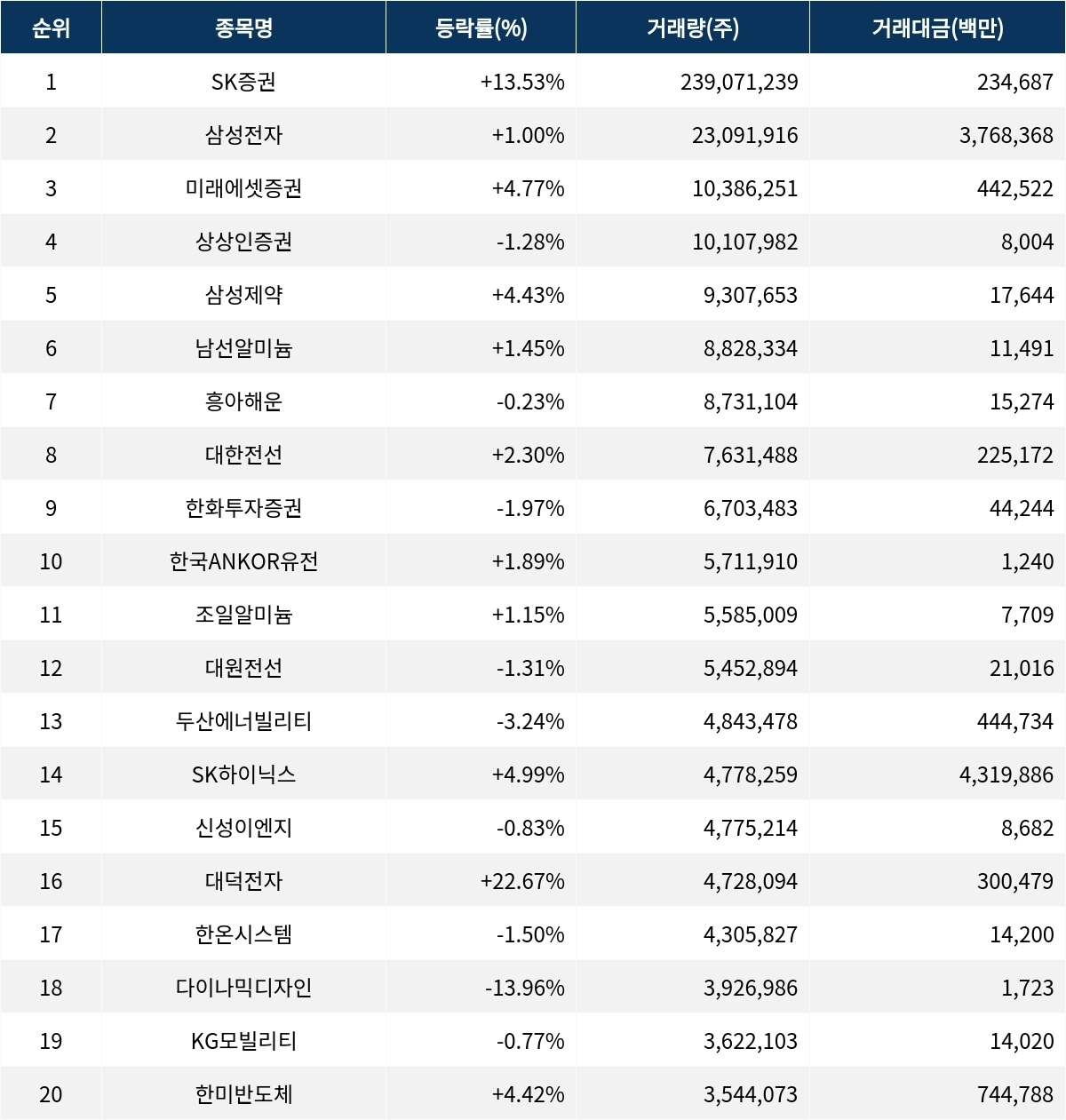한편 거래량 상위 20위권 종목들은 조일알미늄(018470) ▲1.15%, 대원전선(006340) ▼1.31%, 두산에너빌리티(034020) ▼3.24%, SK하이닉스(000660) ▲4.99%, 신성이엔지(011930) ▼0.83%, 대덕전자(353200) ▲22.67%, 한온시스템(018880) ▼1.50%, 다이나믹디자인(145210) ▼13.96%, KG모빌리티(003620) ▼0.77%, 한미반도체(042700) ▲4.42% 등의 성적을 기록했다.