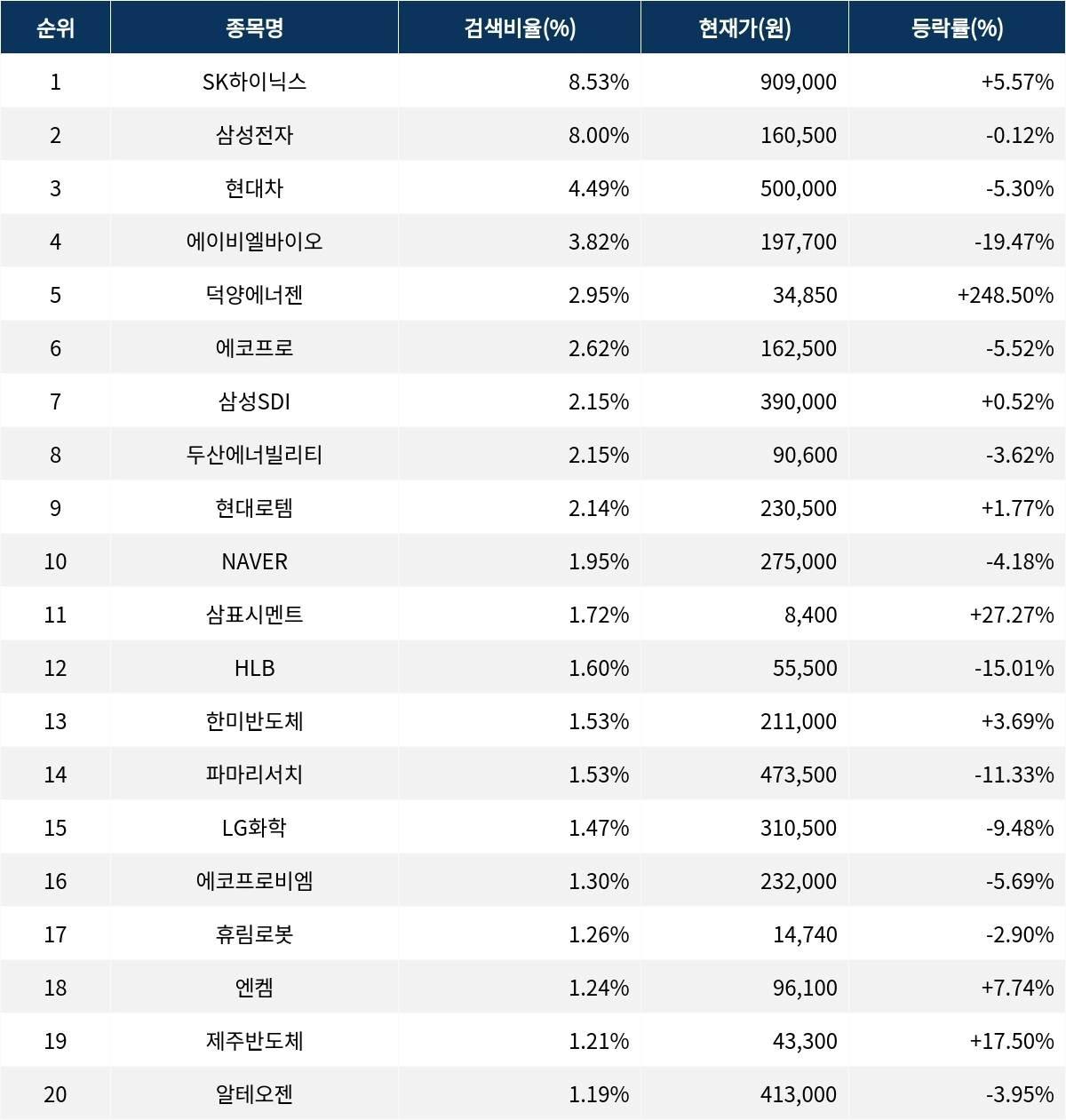 이 밖에도 삼표시멘트(038500) ▲27.27%, HLB(028300) ▼15.01%, 한미반도체(042700) ▲3.69%, 파마리서치(214450) ▼11.33%, LG화학(051910) ▼9.48%, 에코프로비엠(247540) ▼5.69%, 휴림로봇(090710) ▼2.90%, 엔켐(348370) ▲7.74%, 제주반도체(080220) ▲17.50%, 알테오젠(196170) ▼3.95% 등이 많이 검색되고 있다.