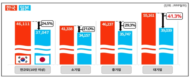 한국과 일본을 비교한 결과 대졸 초임은 한국이 일본보다 높았으며, 규모가 커질수록 격차가 확대됐다. 대졸 초임 평균은 우리나라 4만 6111달러, 일본은 3만 7047달러로 한국이 일본보다 24.5% 높았다. 특히 대기업은 한국(500인 이상)이 5만 5161달러, 일본(1000인 이상)이 3만 9039달러로 41.3% 격차가 나타났다.