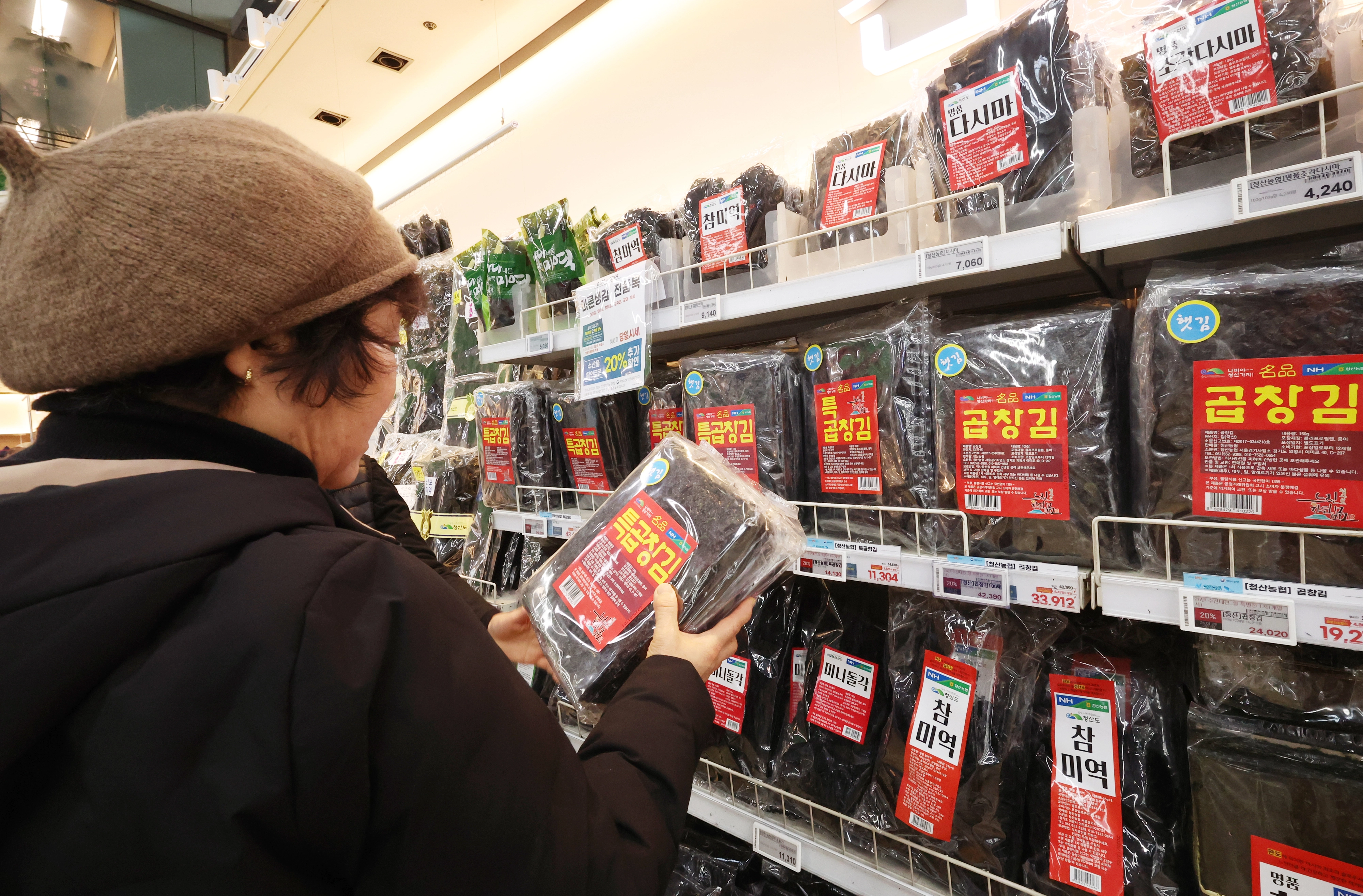 마른김 가격 한 장 150원 첫 돌파 (서울=연합뉴스) 진연수 기자 = 마른김 가격이 3년째 고공행진하면서 역대 최고를 기록했다. 2일 한국농수산식품유통공사 가격정보에 따르면 마른김(중품) 평균 소매가격은 지난 1월 하순 기준 10장당 1천515원으로 집계됐다. 순별 평균 소매가격이 1천500원을 뛰어넘은 것은 사상 처음이다. 사진은 이날 서울 시내 한 대형마트에 진열된 마른김. 2026.2.2 jin90@yna.co.kr (끝) <저작권자(c) 연합뉴스, 무단 전재-재배포, AI 학습 및 활용 금지>