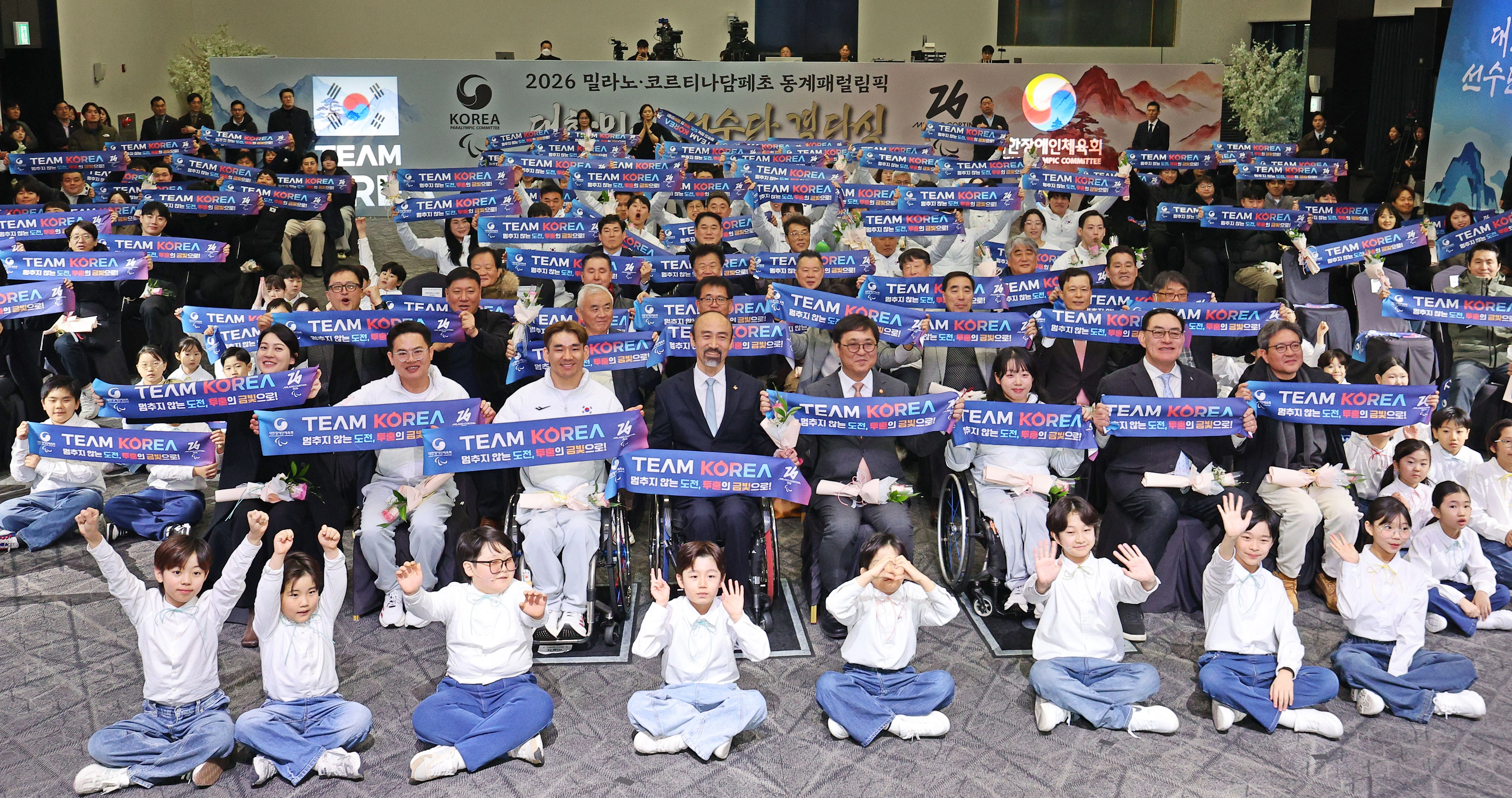 2026 밀라노·코르티나담페초 동계패럴림픽 대한민국 선수단과 관계자들이 2일 서울 송파구 올림픽파크텔에서 열린 결단식에서 응원 문구가 적힌 수건을 펼치며 선전을 다짐하고 있다. 한국은 금메달 1개, 동메달 1개를 목표로 3월 6~15일 이탈리아 일원에서 열리는 패럴림픽에 5개 종목·40여 명이 참가한다. 연합뉴스