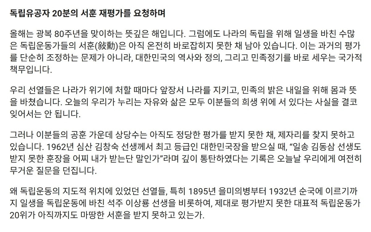 집행위 관계자는 “독립운동을 이끈 핵심 인사들 가운데 상당수가 아직 정당한 평가를 받지 못하고 있다”며 “특별한 희생에는 특별한 보상이 따른다는 원칙을 바로 세워야 한다”고 말했다.