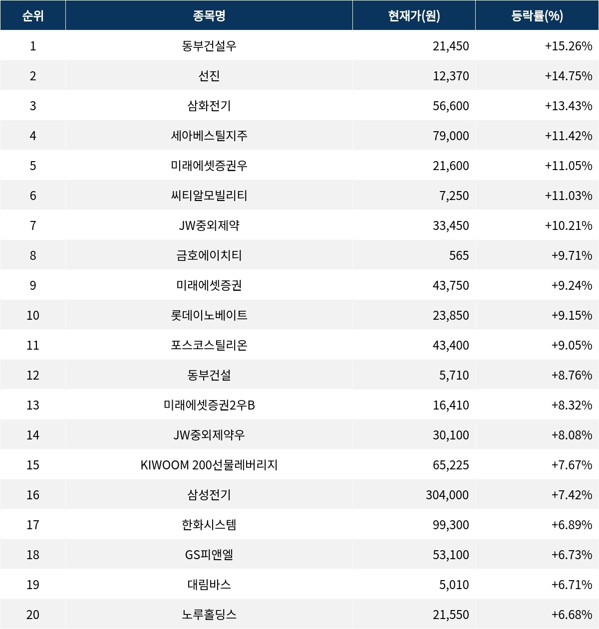 [서울데이터랩]동부건설우 15.26% 급등…실시간 상승률 1위
