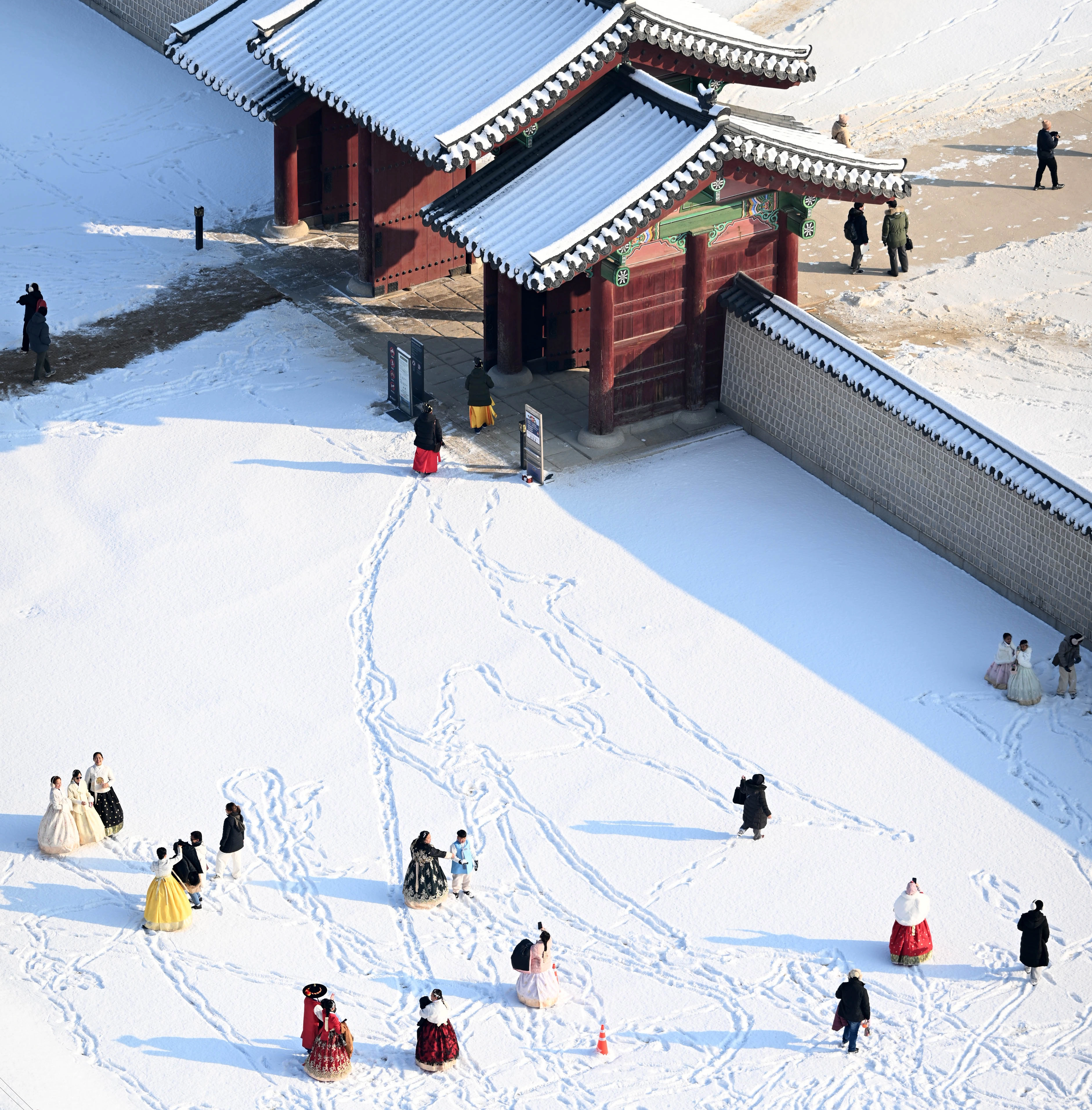 눈 위는 흰 도화지 같습니다. 누군가는 장난을 남기고, 누군가는 발걸음으로 길을 냅니다. 한복 입은 사람들은 서로를 향해 휴대전화를 들며 주인공이 됩니다. 겨울은 차갑지만 몸짓은 따뜻합니다. 눈밭에 남는 것은 발자국보다 웃음에 가깝습니다. 홍윤기 기자