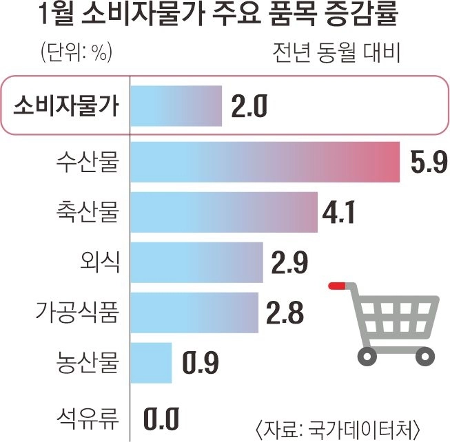 국제유가가 하락한 영향으로 지난달 소비자물가 상승률이 5개월 만에 가장 낮은 2.0%를 기록했다. 하지만 고환율 충격파로 수입 의존도가 높은 일부 생선과 쇠고기 등 설 성수품 중심으로 가격이 평균 상승률을 크게 웃돌면서 장바구니 물가 부담은 여전했다.