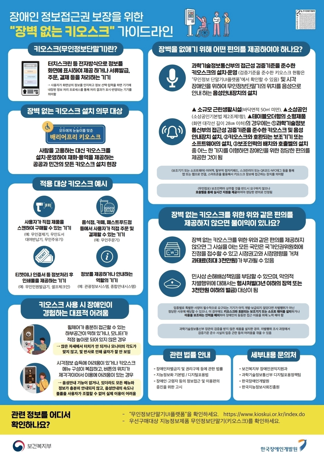 최근 개정된 ‘장애인차별금지 및 권리구제 등에 관한 법률’ 시행령에 따라 공공과 민간에서 키오스크(무인정보단말기)를 설치·운영하는 경우 접근성 검증 기준을 충족하는 기기를 사용하고 시각장애인을 위한 음성 안내 장치를 갖춰야 한다.
