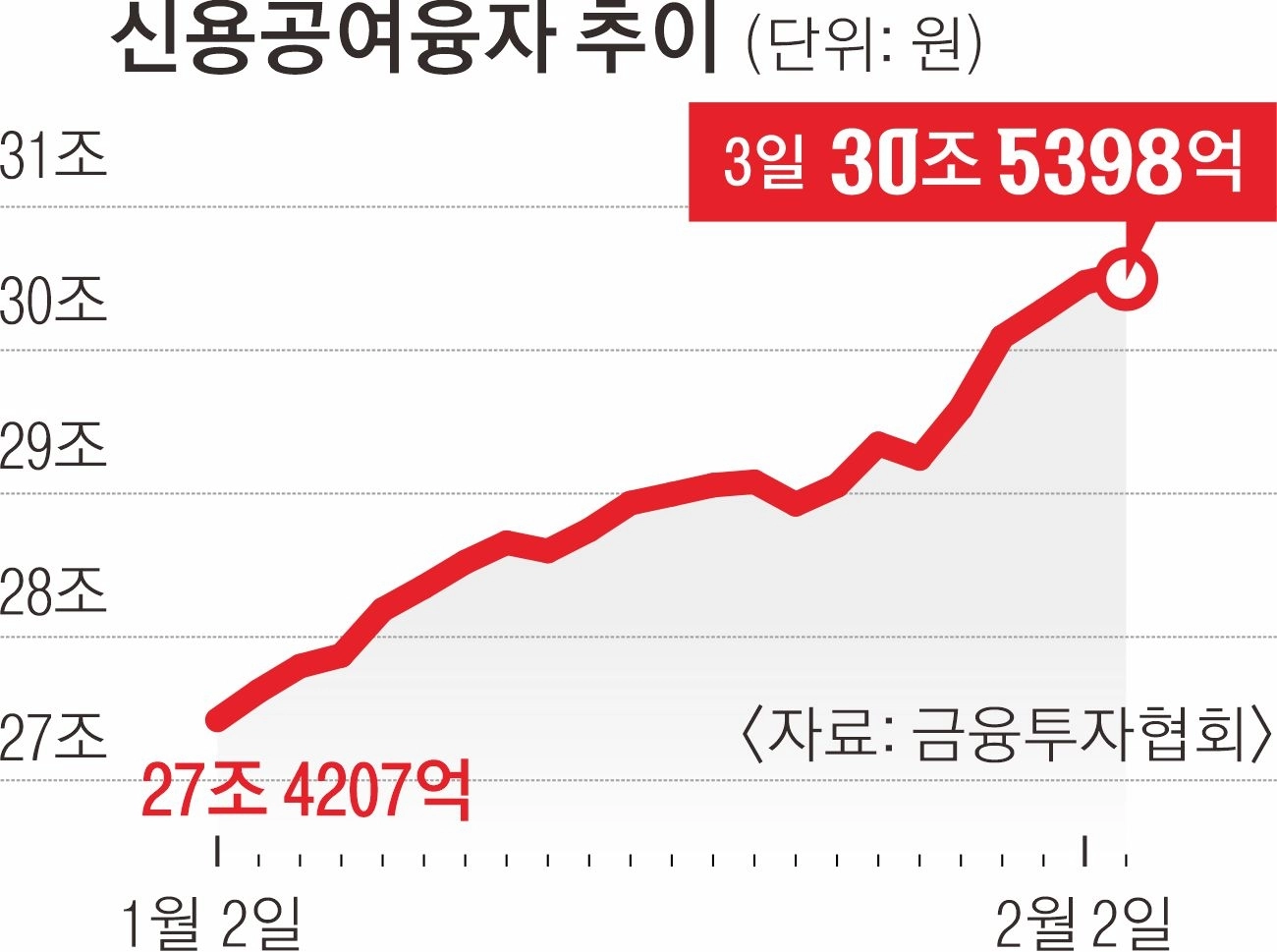 4일 금융투자협회에 따르면 지난 3일 코스피·코스닥 신용거래융자 잔고는 30조 5398억원으로 역대 최대를 기록했다. 지난해 말 27조원대였는데 올해 들어서만 3조 2533억원(11.9%) 늘었다. 코스피 시장에서만 20조원을 넘어섰다. 국내 증시가 지난해에 이어 올해도 강세 흐름을 이어가면서, 빚을 내 수익률을 높이려는 투자 수요가 증가한 것으로 보인다.