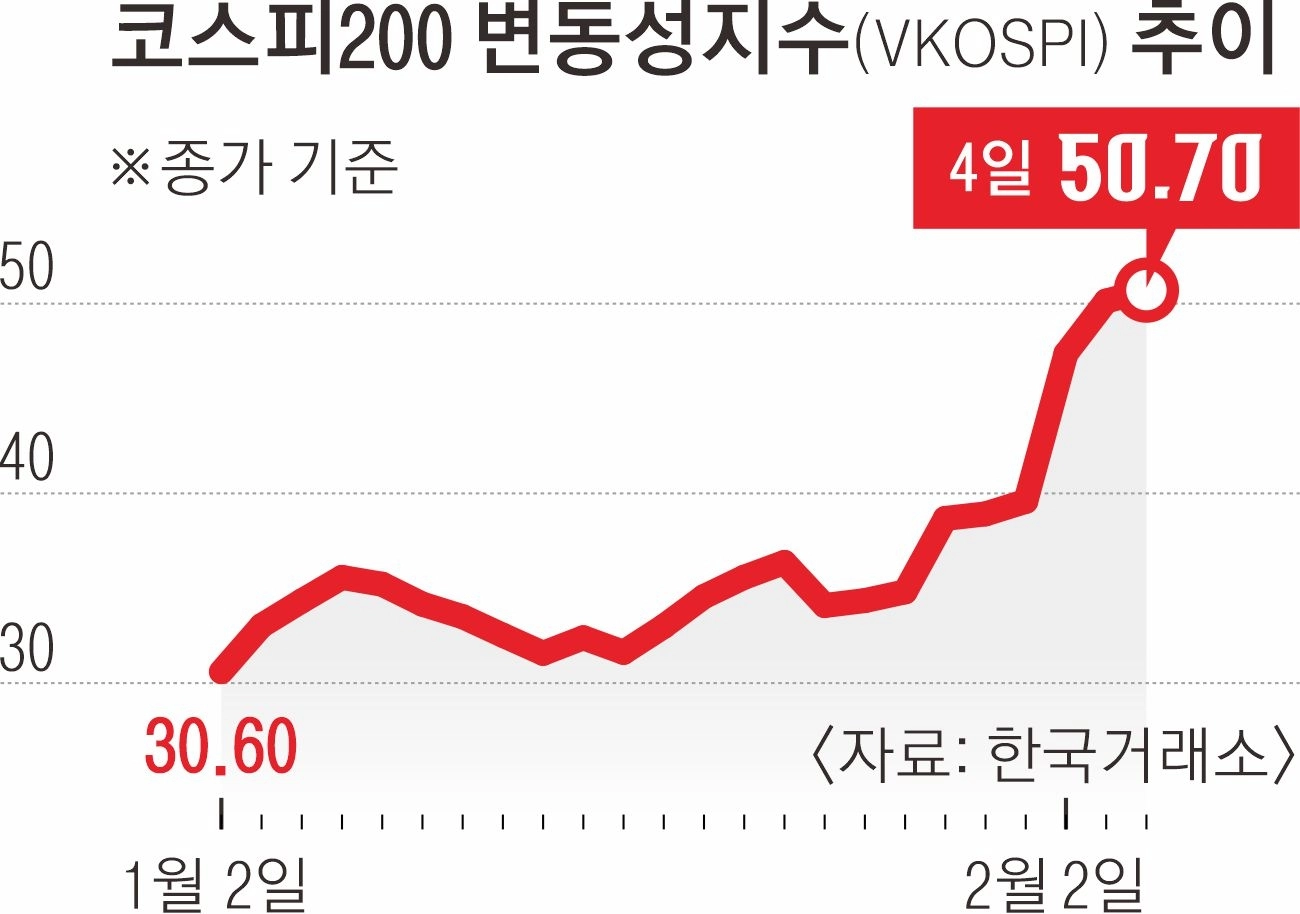 급격한 상승장 속 시장의 불안 심리는 변동성 지표로 확인된다. 이날 VKOSPI는 장중 52.40까지 오르며 70개월 만에 최고치를 기록했다. 이는 코로나19 금융시장 충격이 있었던 2020년 3월 이후 가장 높은 수준이다. 통상 VKOSPI가 40을 넘어서면, 급격한 주가 변동 가능성을 가격에 반영한 ‘공포 구간’으로 해석된다.