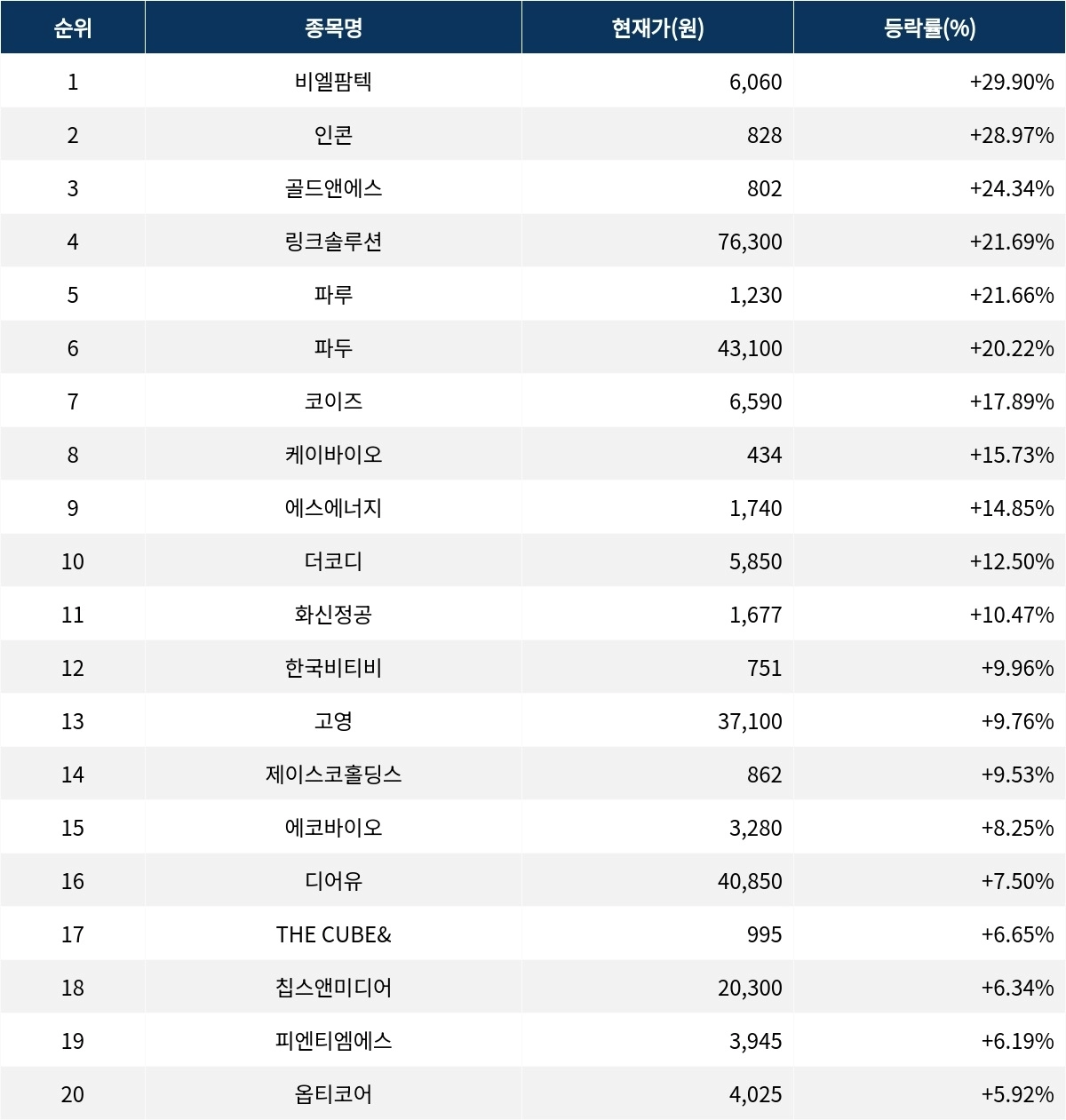 6위 파두(440110)는 현재가 4만 3100원으로 20.22% 급등 중이다. 7위 코이즈(121850)는 현재가 6590원으로 17.89% 급등 중이다. 8위 케이바이오(038530)는 현재가 434원으로 15.73% 급등 중이다. 9위 에스에너지(095910)는 현재가 1740원으로 14.85% 급등 중이다. 10위 더코디(224060)는 현재가 5850원으로 12.50% 급등 중이다.
