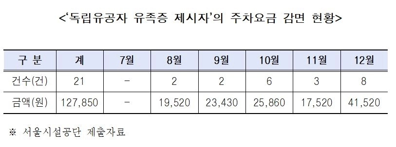 실제로 2025년 7월부터 시행된 ‘독립유공자 유족증 제시자’ 공영주차장 요금 50% 감면 실적을 분석한 결과, 같은 해 12월까지 6개월간 감면 건수는 총 21건, 감면액은 12만 7850원으로 나타났고, 이는 감면 확대가 서울시에 미치는 재정적 영향이 매우 제한적임을 보여준다.