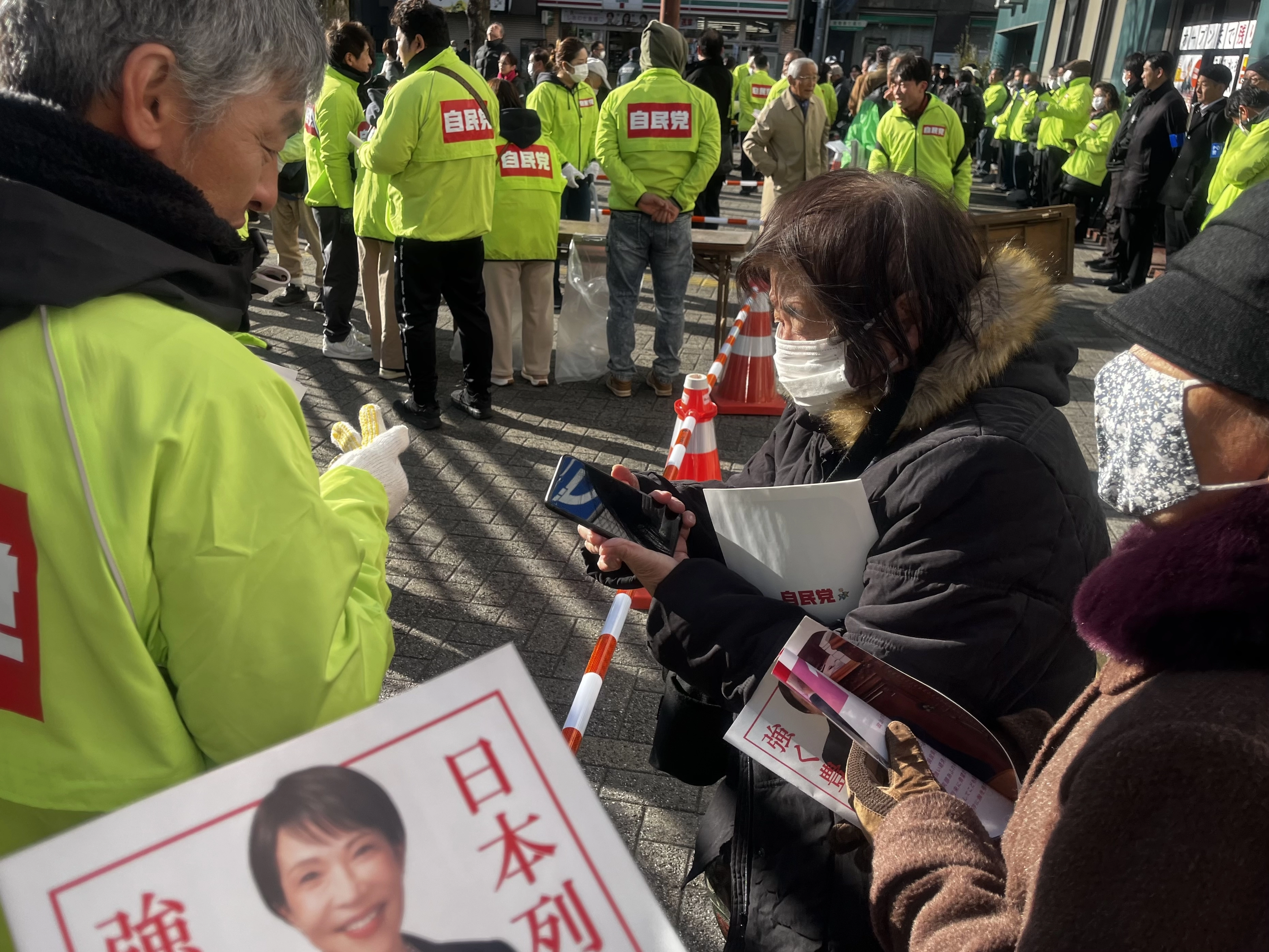 지난 3일 오전 사이타마현 구키역 광장에서 시민들이 자민당 스태프가 배포한 다카이치 사나에 총리의 사진과 주요 정책이 담긴 팸플릿을 받아보고 있다. 사이타마 명희진 특파원