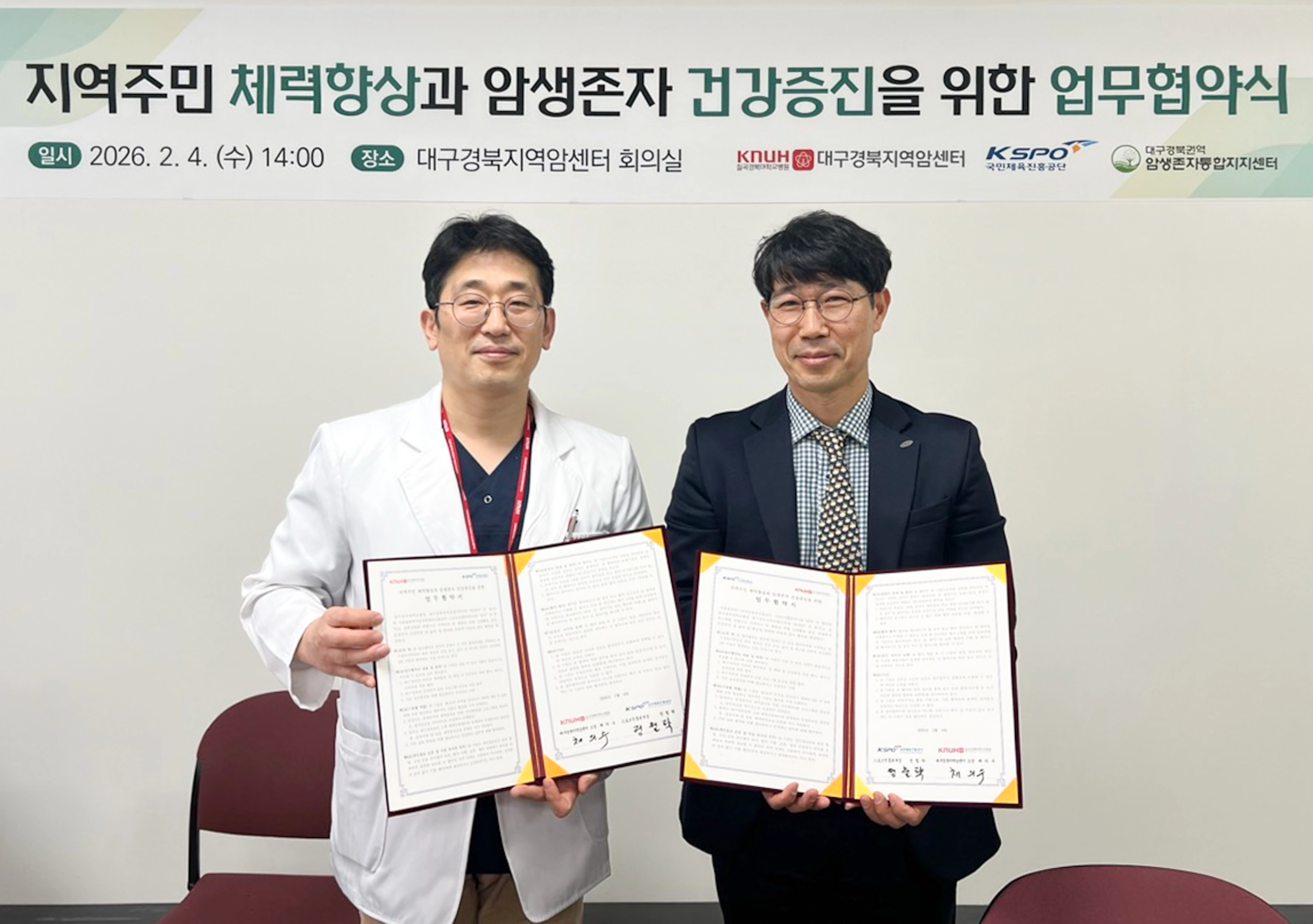 국민체육진흥공단은 5일 칠곡경북대병원 대구경북지역암센터와 대구·경북 지역 암생존자의 건강 증진과 지역 주민의 체력 향상을 위한 업무협약을 체결했다고 밝혔다.