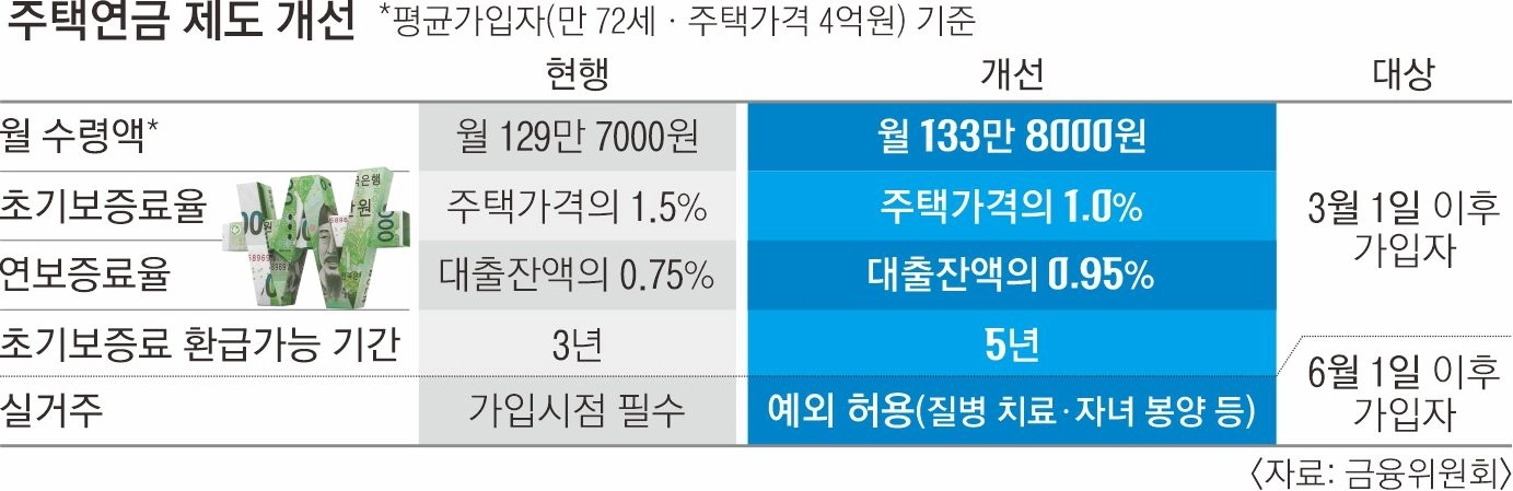 가입 부담을 완화하기 위해 주택연금 초기보증료는 주택가의 1.5%에서 1.0%로 인하한다. 초기보증료 환급 가능 기간은 3년에서 5년으로 확대한다. 다만, 보증료 감소로 연금 수령액이 줄어드는 것을 방지하기 위해 연 보증료는 대출 잔액의 0.75%에서 0.95%로 소폭 인상한다. 수령액 인상과 초기보증료 인하 등은 3월 1일부터 주택연금 신규 가입자에게 적용되며 기존 가입자에게 소급 적용은 되지 않는다.