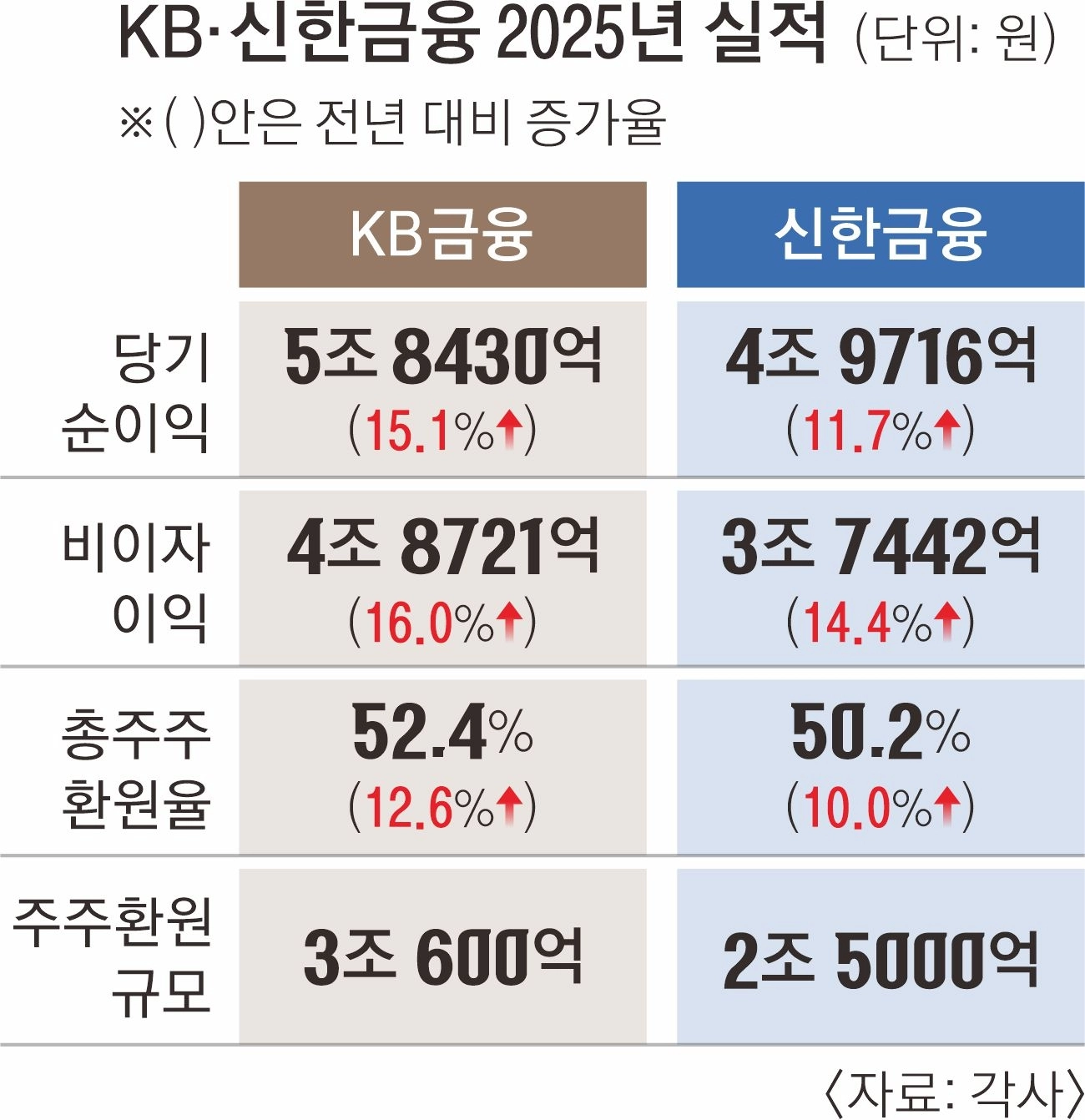 5일 각 사 공시에 따르면 KB금융의 2025년 연결 기준 당기순이익은 5조 8430억원으로 전년 대비 15.1% 증가했다. 신한금융도 같은 기간 4조 9716억원의 순이익을 기록해 전년보다 11.7% 늘었다. 연간 순이익 기준으로는 KB금융이 신한금융을 8714억원 앞서며 2년 연속 ‘리딩금융’ 자리를 지켰다.