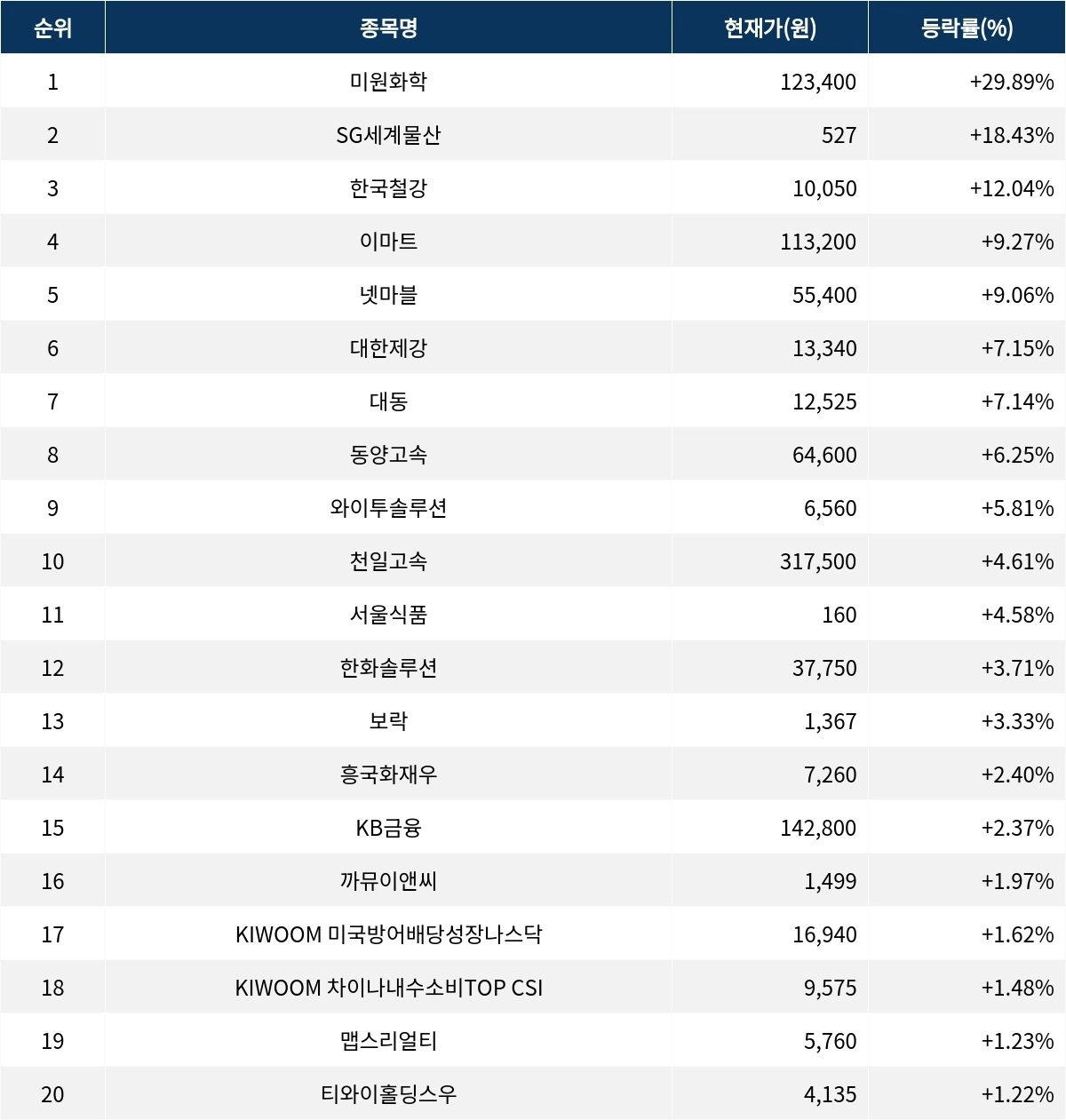 이날 상승률 1위를 기록한 종목은?