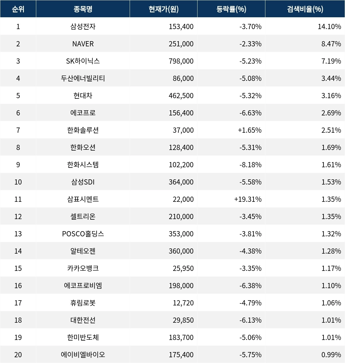 이 밖에도 삼표시멘트(038500) ▲19.31%, 셀트리온(068270) ▼3.45%, POSCO홀딩스(005490) ▼3.81%, 알테오젠(196170) ▼4.38%, 카카오뱅크(323410) ▼3.35%, 에코프로비엠(247540) ▼6.38%, 휴림로봇(090710) ▼4.79%, 대한전선(001440) ▼6.13%, 한미반도체(042700) ▼5.06%, 에이비엘바이오(298380) ▼5.75% 등이 많이 검색되고 있다.