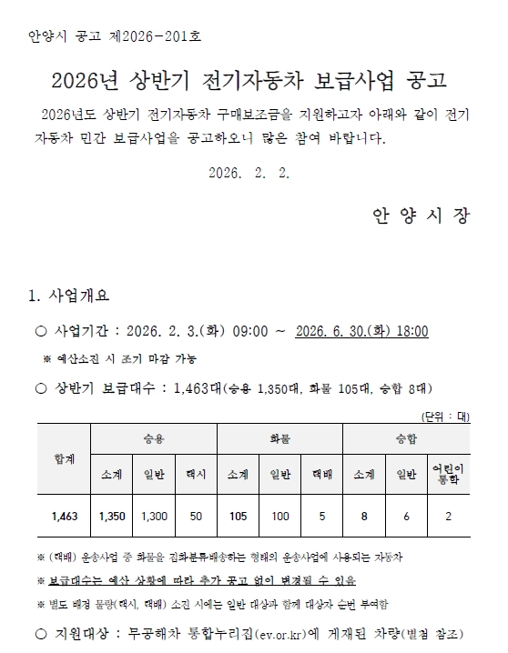 최대호 안양시장은 “이번 사업은 단순한 전기차 보급을 넘어 청년과 다자녀 가구 등 실질적 지원이 필요한 시민들의 구매 문턱을 낮추는 데 중점을 두었다”며 “앞으로도 시민 일상에 도움이 되는 친환경 교통 정책을 지속적으로 발굴해 ‘기후 안심도시 안양’을 만들어가겠다”고 강조했다.