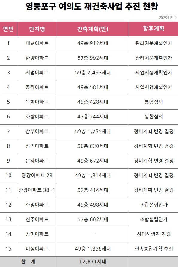 여의도는 오랜 기간 계획적 개발이 제한돼 중·저층 노후 아파트 단지가 밀집된 지역이었지만 서울시의 한강변 고도 제한 완화 발표 이후 재건축 사업에 탄력이 붙었다. 현재 추진 중인 정비사업 대부분은 기존 주거단지를 최고 47~59층 규모의 고층 주거단지로 탈바꿈해 주택 공급 확대와 주거 환경 개선을 동시에 목표로 하고 있다.
