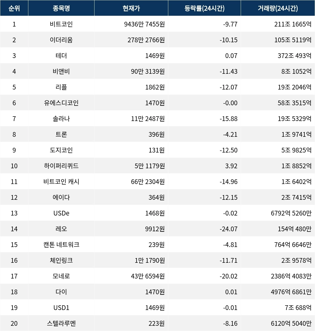 모네로는 43만 6594원에 거래되며 24시간 동안 -20.02% 하락했다. 시가총액은 8조 537억 원이다. 같은 시각, 다이는 1470원에 거래되며 24시간 동안 0.01% 상승했다. 시가총액은 7조 8878억 원이다. USD1은 1469원에 거래되며 24시간 동안 -0.01% 하락했다. 시가총액은 7조 5372억 원이다. 스텔라루멘은 223원에 거래되며 24시간 동안 -8.16% 하락했다. 시가총액은 7조 2972억 원이다.