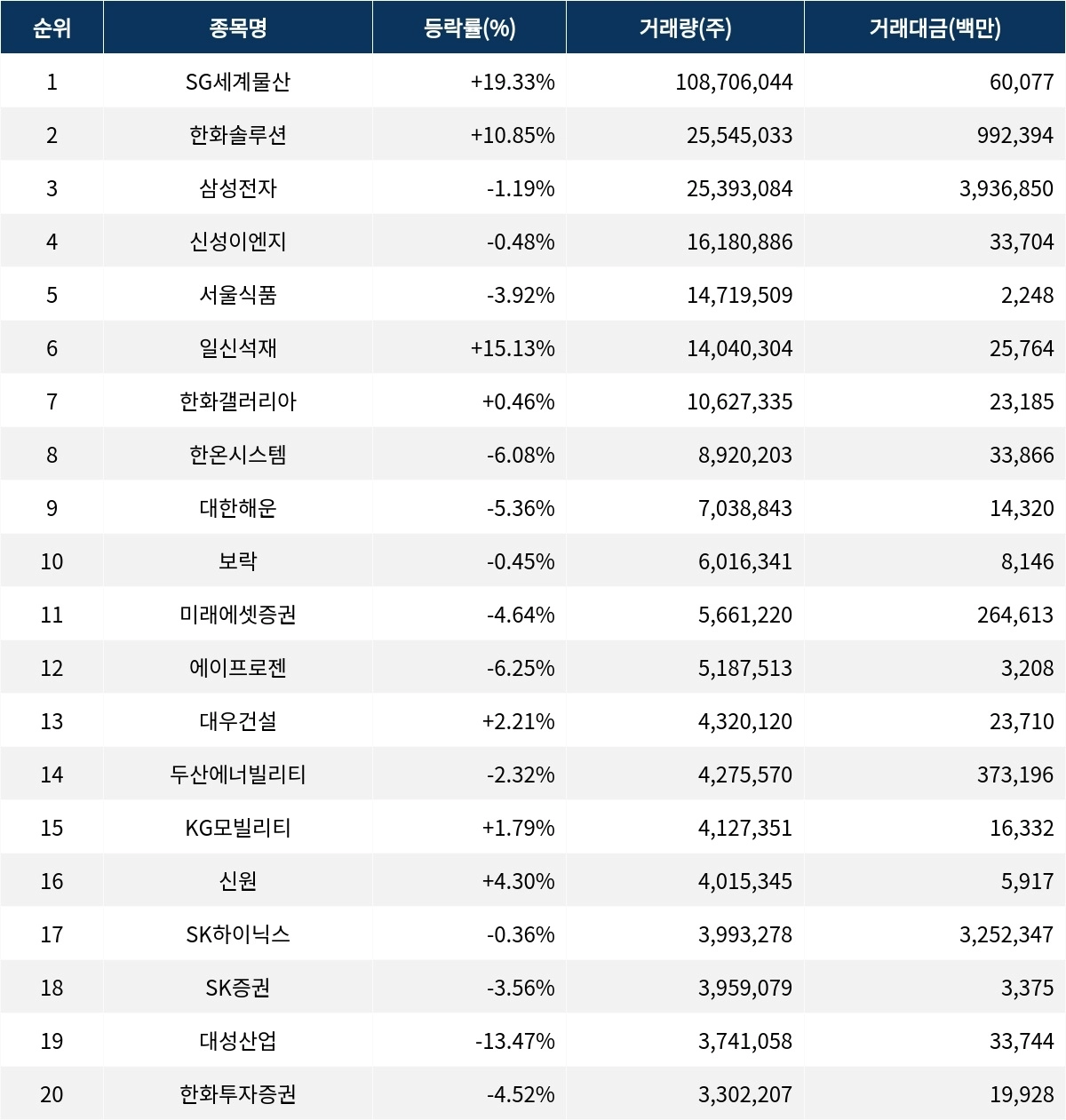 한편 거래량 상위 20위권 종목들은 미래에셋증권(006800) ▼4.64%, 에이프로젠(007460) ▼6.25%, 대우건설(047040) ▲2.21%, 두산에너빌리티(034020) ▼2.32%, KG모빌리티(003620) ▲1.79%, 신원(009270) ▲4.30%, SK하이닉스(000660) ▼0.36%, SK증권(001510) ▼3.56%, 대성산업(128820) ▼13.47%, 한화투자증권(003530) ▼4.52% 등의 성적을 기록했다.
